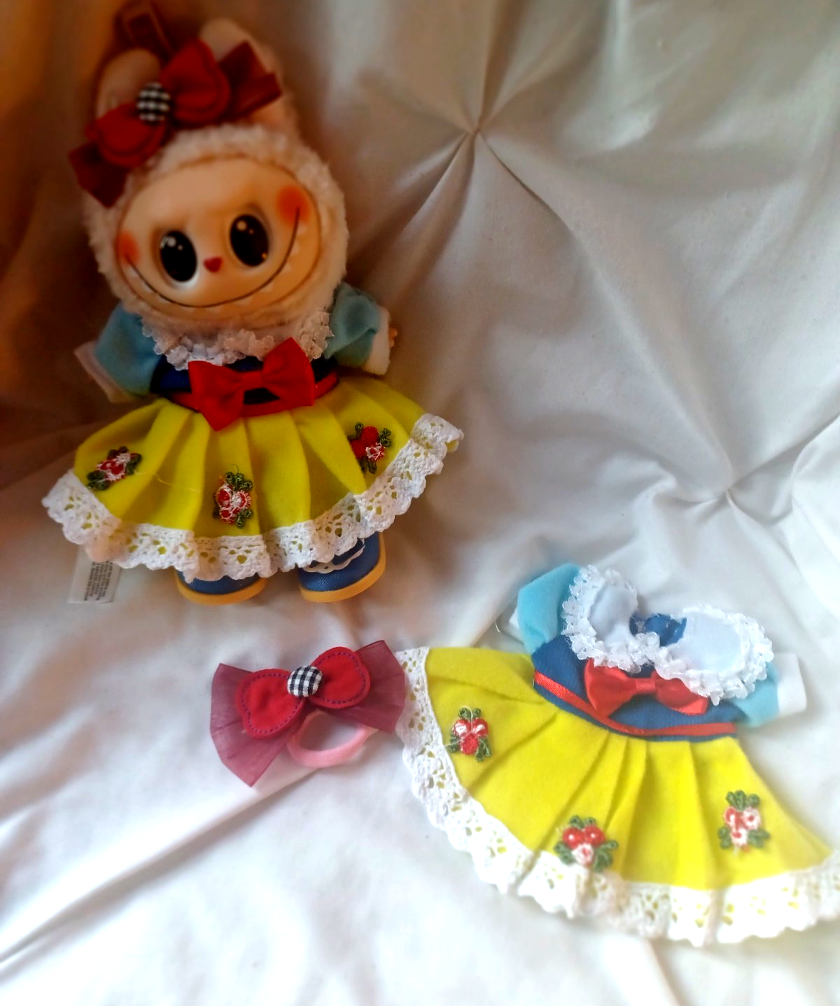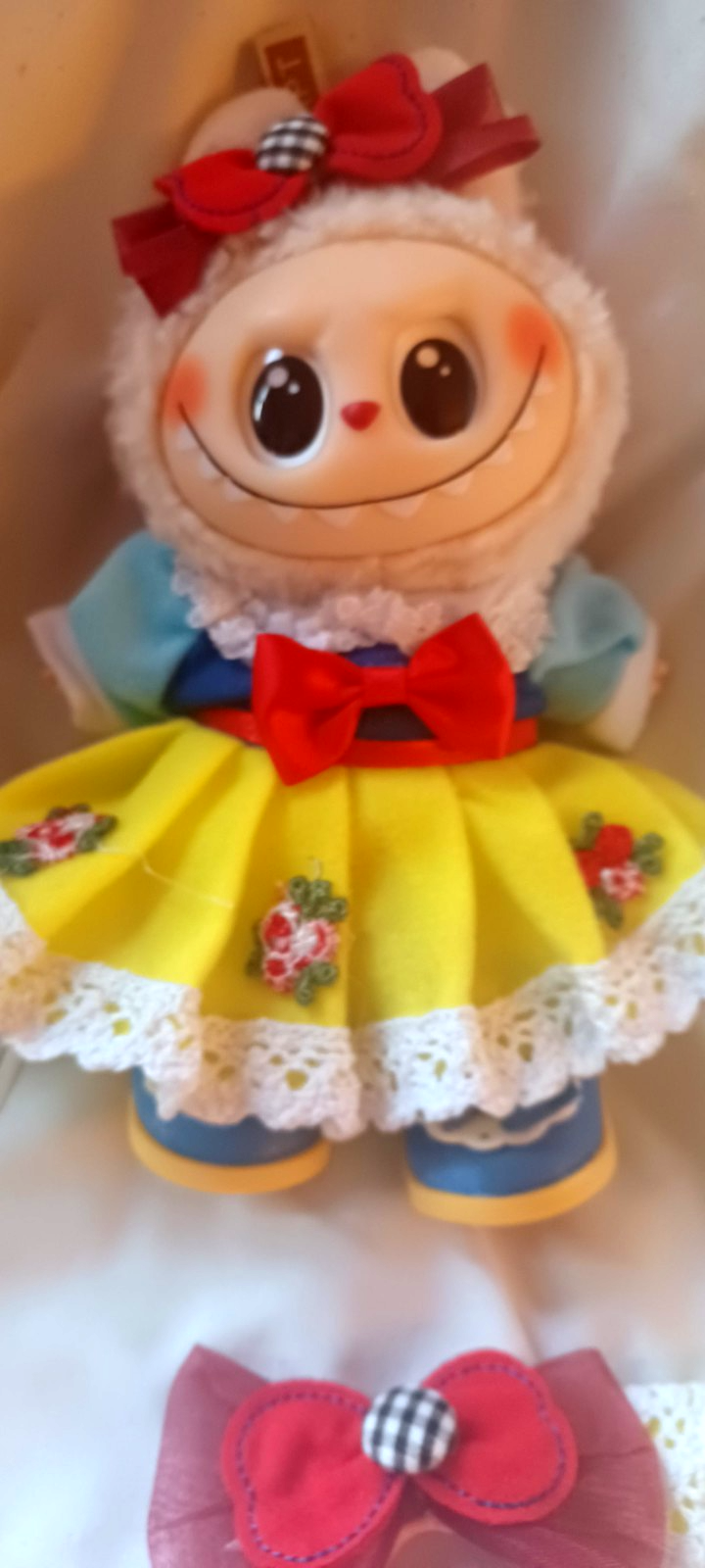 The Labubu Doll outfit resembles Snow White. It includes Dress Hair Bow and Shoes. The little plush doll is INCLUDED "The Monster" in a designer and urban vinyl theme. Made of plush material, this licensed reproduction of a Monster franchise doll is a must-have for fans of this unique and playful character. Doll has no box or card. I order these and dress them. These are nice reproductions of the Monsters. Please take time to see all my great items in my E-bay store. Buy with confidence! I have had my E-bay store for nearly 20 years with 100% positive feedback. I carry great gift and collector items. Please add me to your favorite store list. Also sign up for my store e-mail that comes out once every 2 weeks to see new items. If you have any questions please message me. Thanks for looking and I hope to do business with you soon. SMOKE FREE HOME I WILL COMBINE SHIPPING ON ALL MY ITEMS FOR YOU!