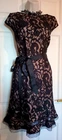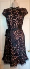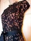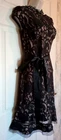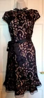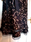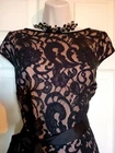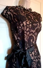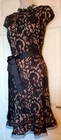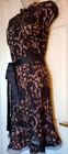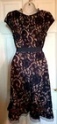 C332 Lovely Black lace overlay retro 50s pinup style flared hem dress - great retro style ideal for special occasions and parties Mid weight black lace fabric over a nude lining Fitted bodice with flared ruffle hem knee-length skirt Zip fastening at the back Removable adjustable ribbon belt can be tied in a bow at the front or back Short cap sleeves Marked as a size 10 but Please π π π check measurements π to make sure she will fit you before purchase Waist 30" Bust 34" Length shoulder to hem 37" Please take a look at the other vintage and vintage inspired listings I have Thank you π I'm happy to combine postage