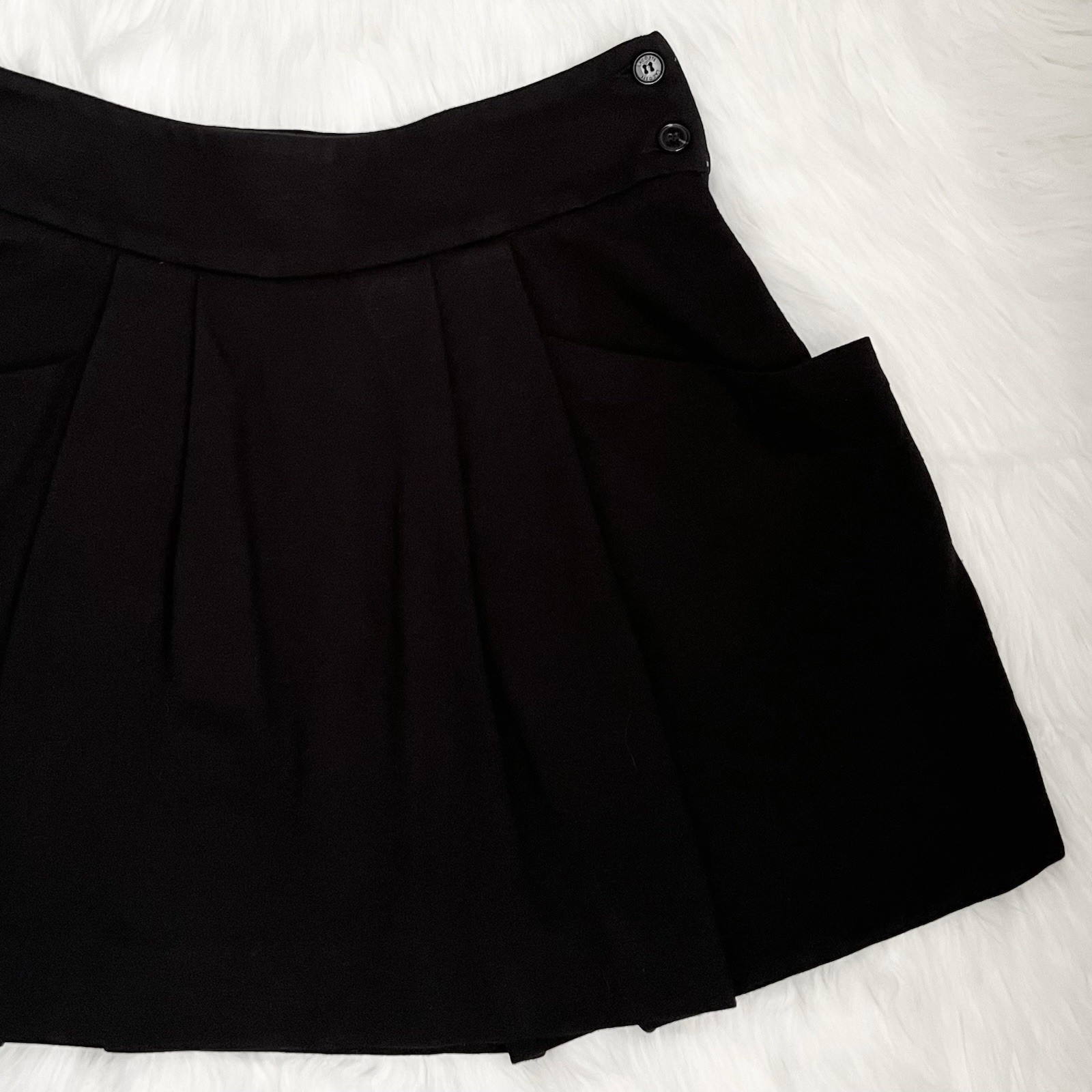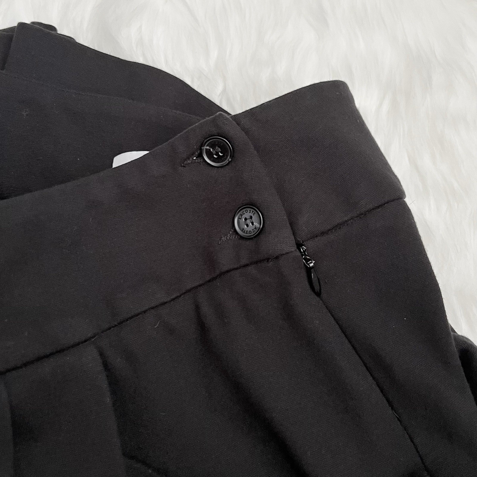 Lacoste Black Pleated Mini Skirt with Side Buttons Detail & Deep Pockets Size 34 71% Viscose 23% Nylon 6% Elastane Side Zipper #miniskirt #lacoste #preppy #chic #skirt Approximate Measurements (straight across): Waist 13.5” Length 16.5” 14.9 pleated skirt, side button detail, high-waist, black mini, chic fashion, preppy style, deep pockets, zipper closure, viscose blend
