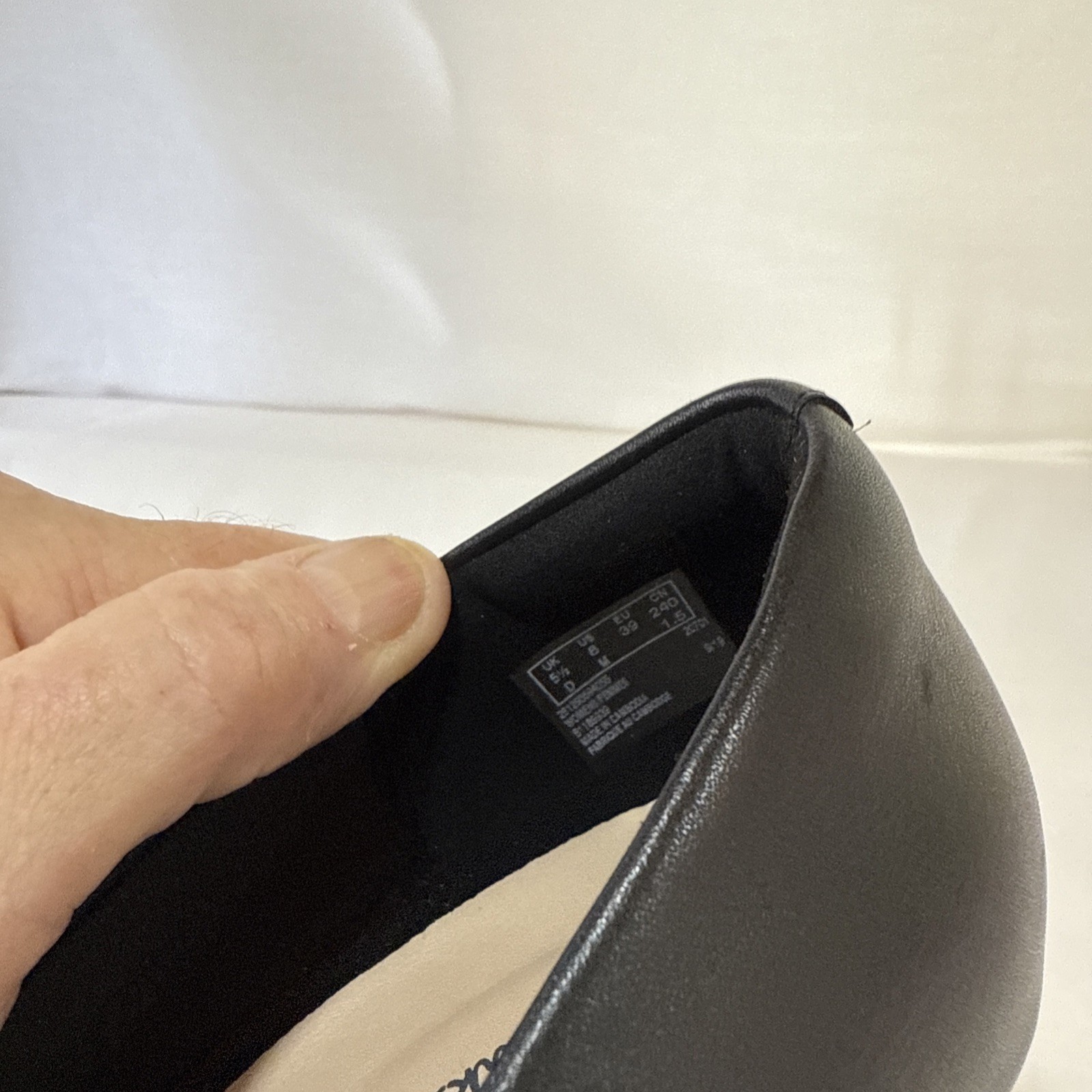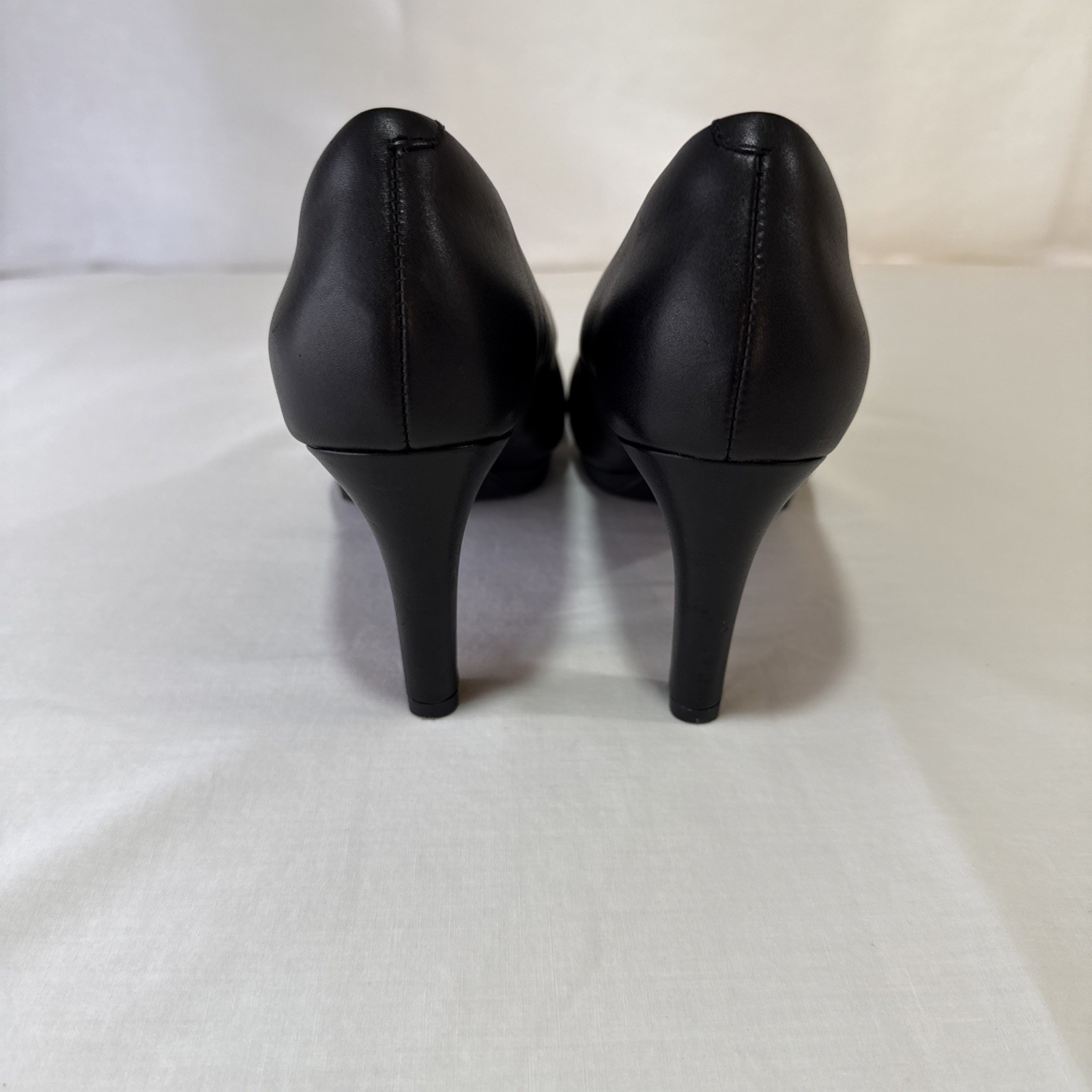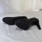 This product is a pair of ladies' Clarks Collection pump heels in size 8M, featuring a solid black leather design with an almond toe shape and slip-on closure. The block heel style offers both comfort and stability, making it suitable for casual and business occasions. The leather upper material and cushioned insole provide a comfortable fit, while the slip-resistant feature ensures safety. Made in Cambodia