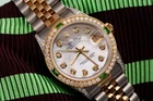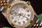 Ladies Rolex Datejust 31 mm White Mother Of Pearl Dial Diamond & Emerald Watch Brand: Rolex Series: Datejust Model: 68273 Case Diameter: 31 mm Bracelet: Jubilee band; 18k yellow gold & stainless steel Bezel: Custom set diamond/emerald, 18k gold plated Dial: Custom set white mother of pearl diamond dial Carat Weight: 2.42 carats in total diamond weight The sale includes a jewelry watch box and an appraisal certificate which states the watch's credentials Attached to the appraisal certificate is our 1 year mechanical warranty and lifetime diamond replacement warranty Diamonds are set aftermarket not originally by Rolex