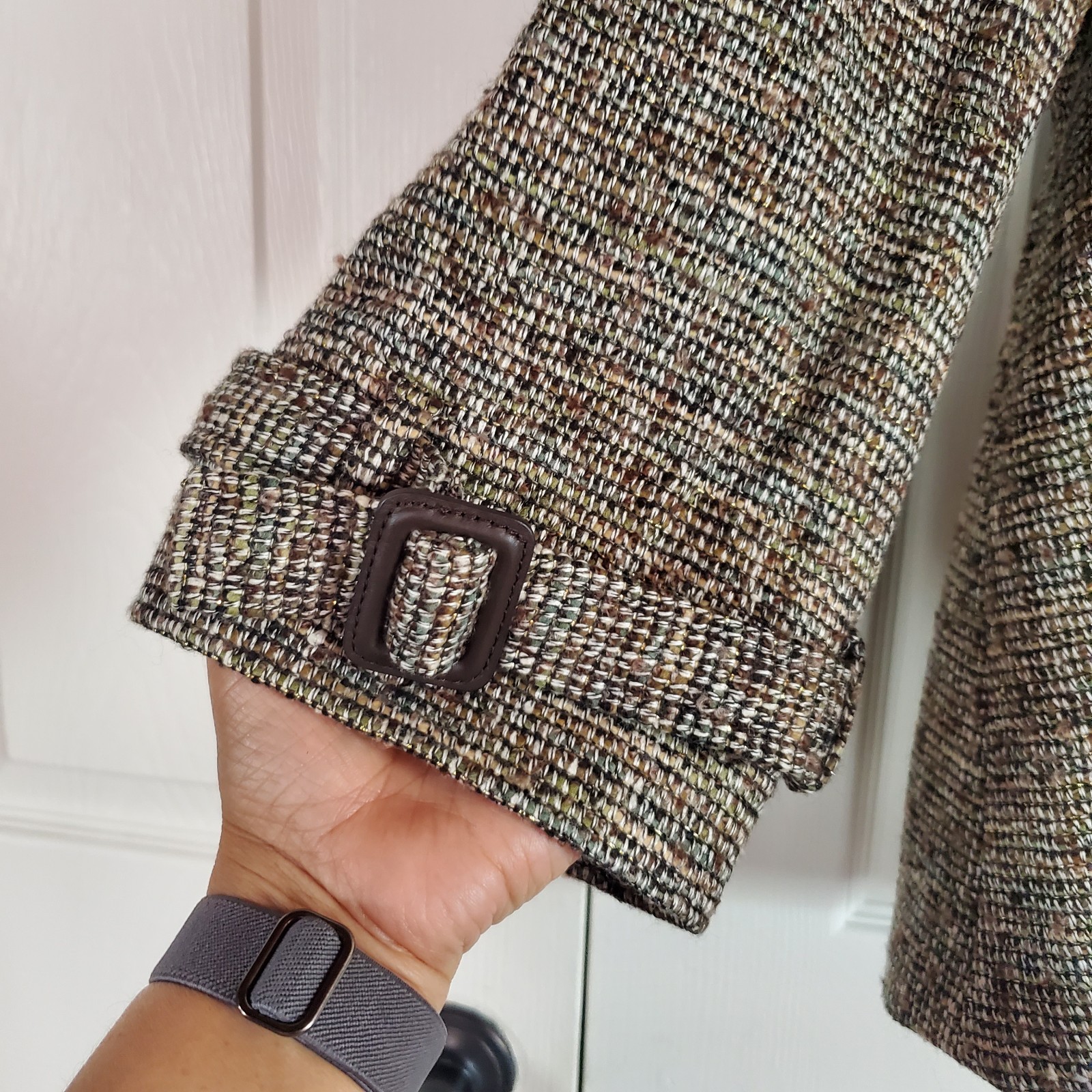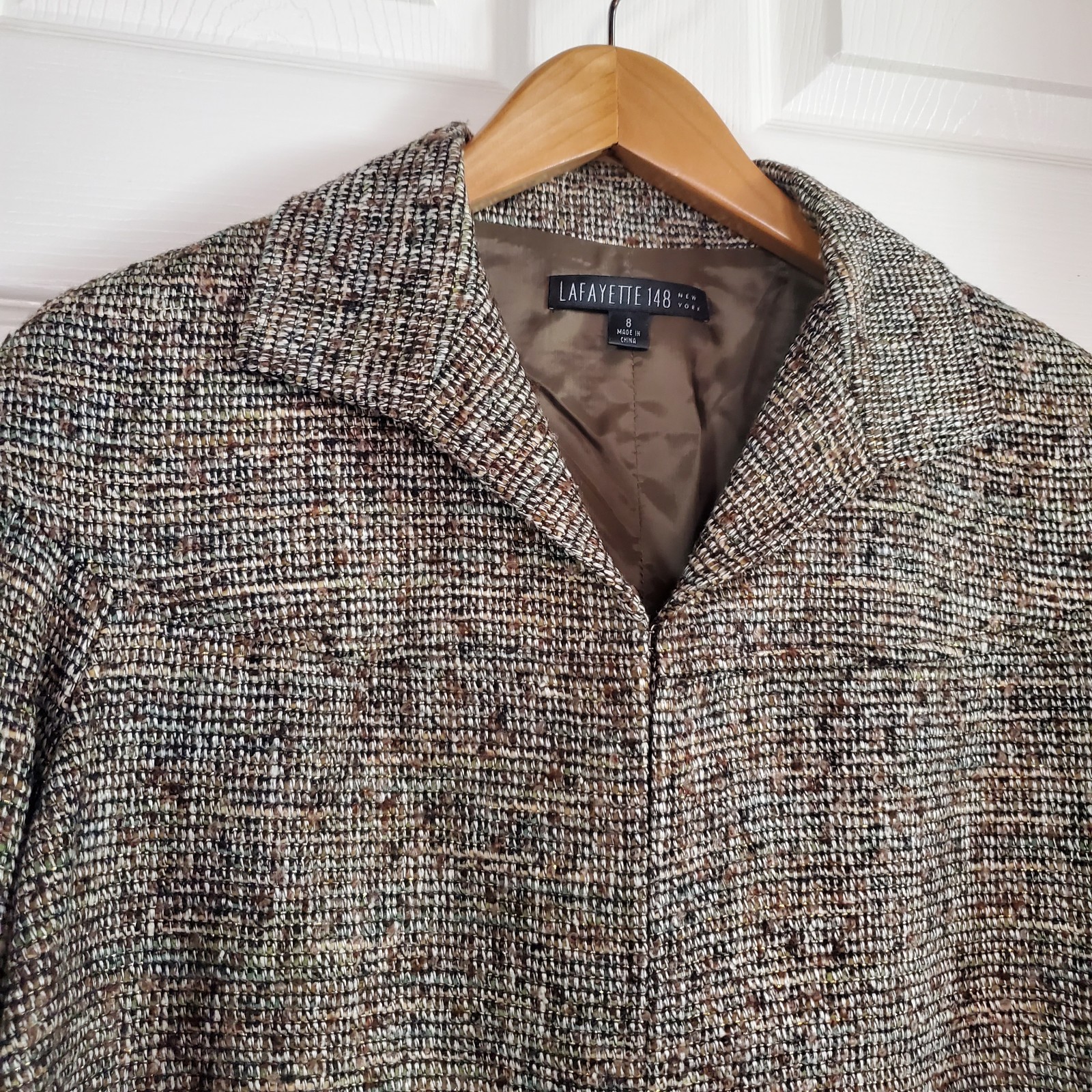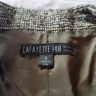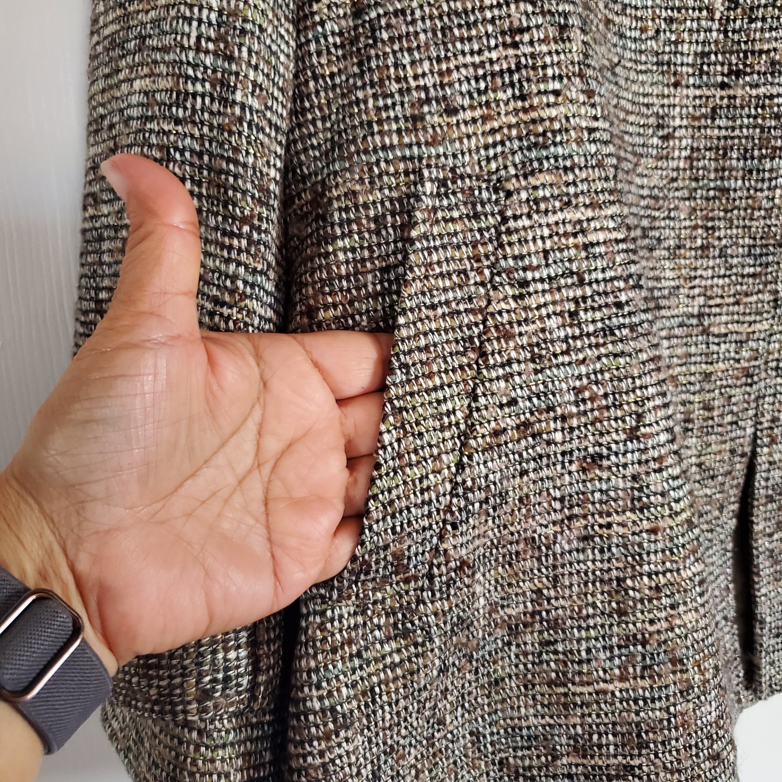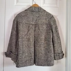 Stylish tweed jacket with a classic design. Features a neutral color palette. Two side pockets. Buckle detail at hem. 3 Hooked-and-eye front closure. Lined. In excellent condition. Please see pictures for details and let me know if you have any questions I ship the next business day