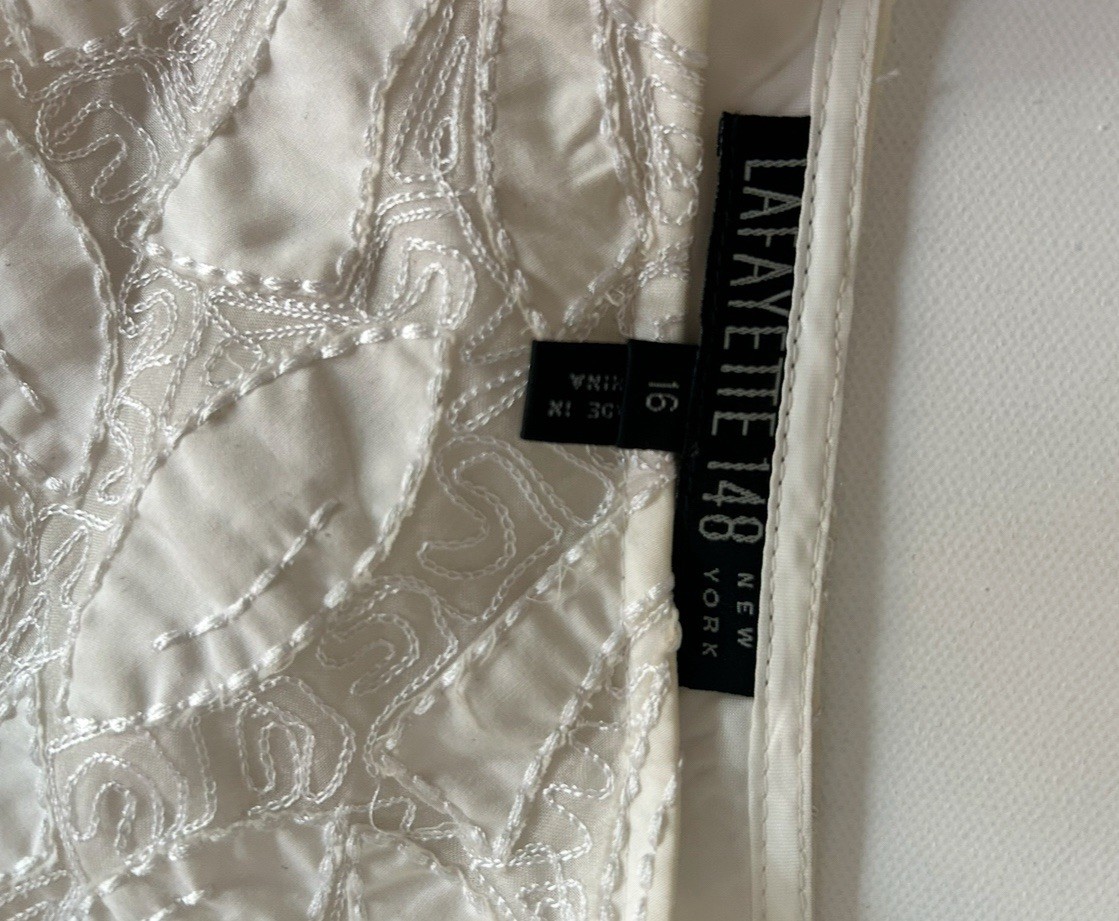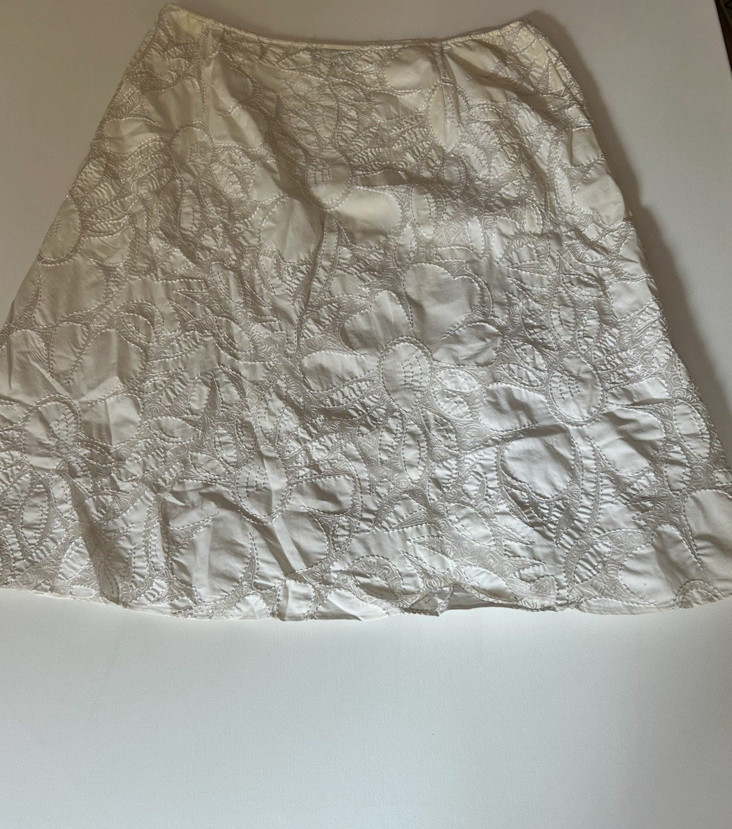 The Lafayette 148 White Cotton Floral Detail Skirt in size 16 is a stylish and classic piece for women. Made from high-quality cotton, this A-line skirt features a beautiful floral pattern and is knee-length, making it a versatile addition to any wardrobe. The skirt is lined for added comfort and sophistication, perfect for both casual and formal occasions. With its timeless design and impeccable craftsmanship, this skirt is a must-have for any fashion-forward woman. Flat lay measurements 18 inches at waist 28 inches top to bottom Inv s-15