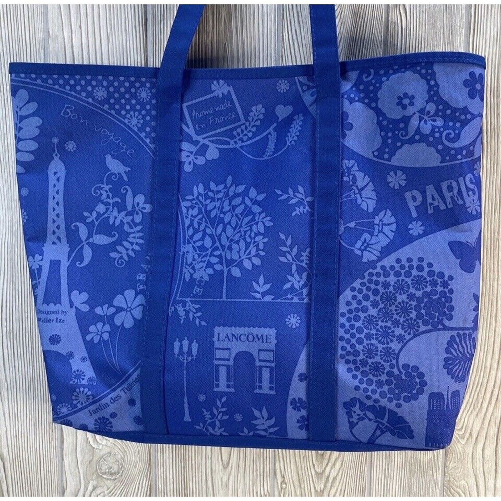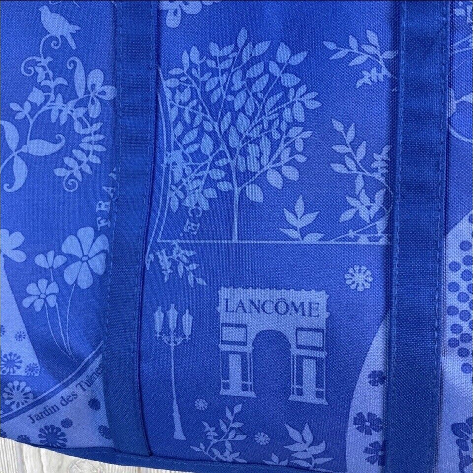 Lancome Paris Blue Summer Canvas Tote Shopping Beach Bag. Size is approximately 17" x 14" x 4". Good condition, minor wear consistent with age and use. See photos.