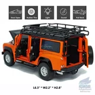 Item Type Diecast & Toy Vehicles > Cars, Trucks & Vans Scale 1:32 Material Diecast and ABS Color Orange Dimension L6.3" * W2.2" * H2.8"/ L16 * W5.5 * H7 cm Vehicle Type Off-road Vehicle/ SU V Specifics 1) Four doors, engine hood and trunk can open 2) With sound and light effect by opening the front door or pressing the front wheels Packaging Packed in bubble wrap, WITHOUT original color box Power 3 x AG13/LR44 button cell, power is just for light and sound Tips Great choice of gift for kids, especially for Birthday, Christmas and New Year Gift Great item for collector, business gift, home decoration, office decoration, display Notice 1) Due to manual measurement, please allow a little error 2) Due to different monitors, the picture and actual item may be slightly different 3) For the shipping security, we will remove the battery Package include 1 x 1/32 Land Rover Defender Off-road Model Car ( Batteries Not Included )