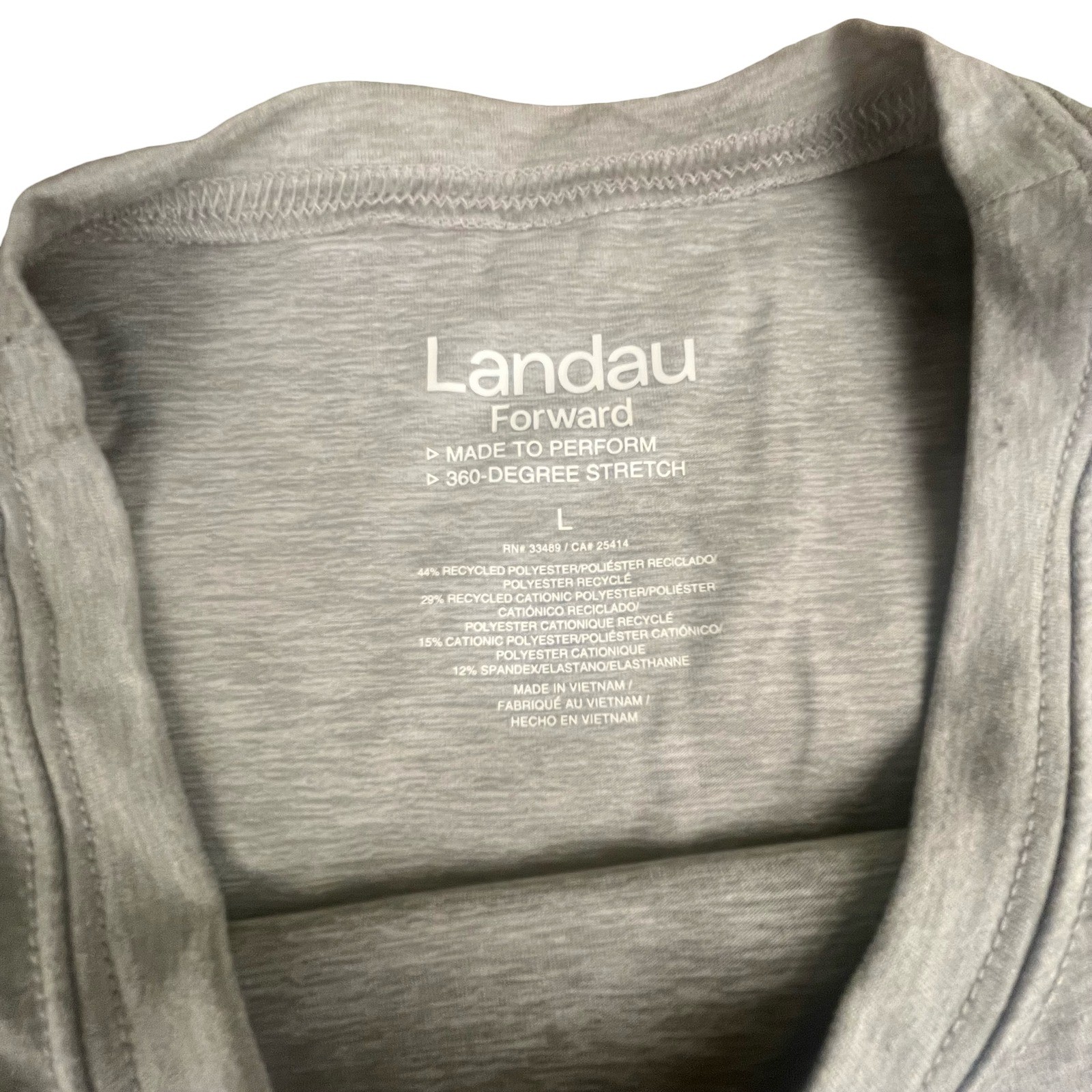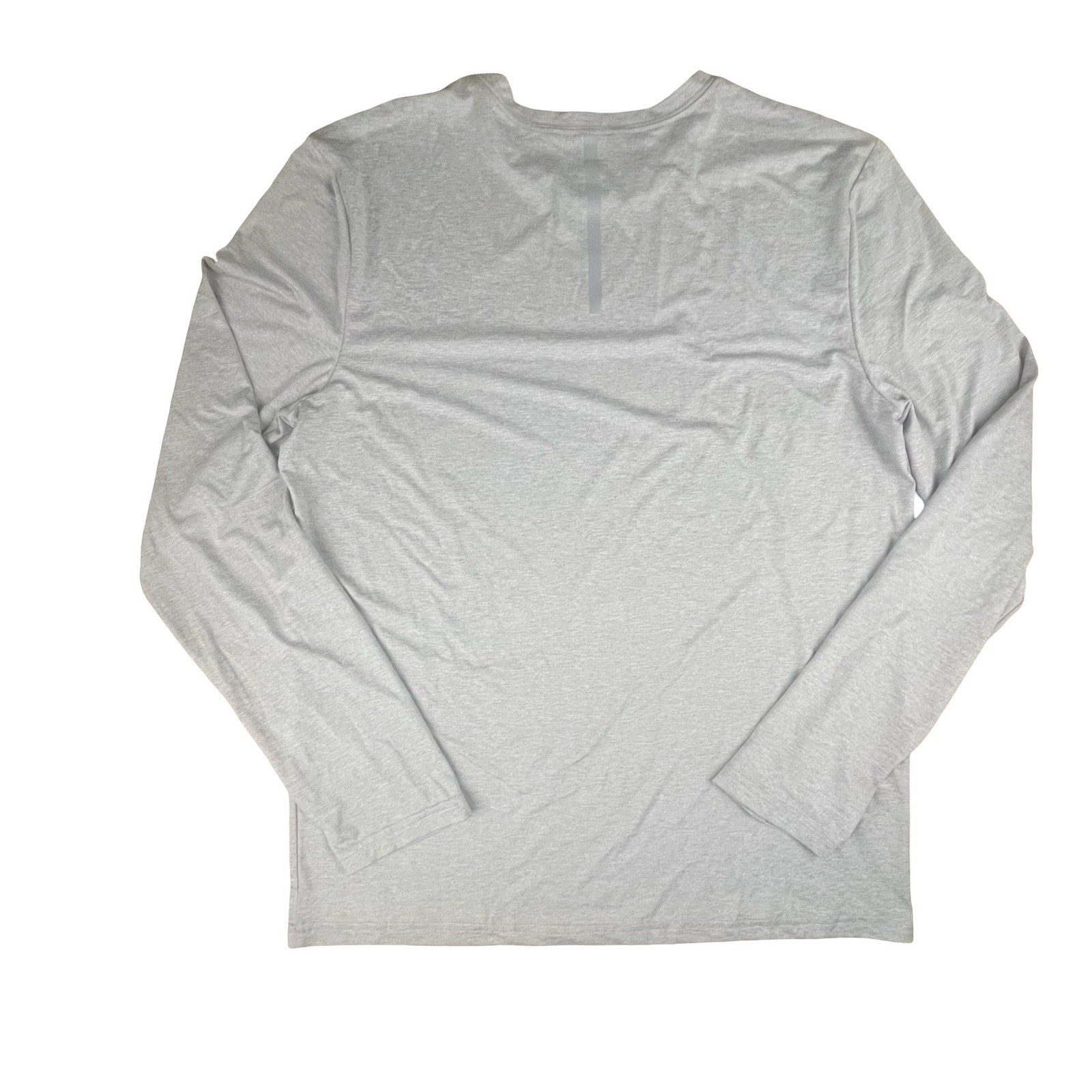 Landau Forward performance long sleeve tee in a light gray heather. Designed for active wear or as a high-quality scrub base layer, this shirt features 360-degree stretch fabric for maximum mobility. The moisture-wicking blend of recycled polyester and spandex ensures comfort throughout the day, while the athletic fit and clean crew neck design offer a modern look. Finished with a subtle reflective vertical strip on the upper back for visibility. Measurements: • Chest: 21.5" (43" doubled) • Length: 28.5"