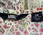 This is a colorful floral tunic blouse by Lands' End, designed in size 3X for women. Made of lightweight cotton fabric with eyelet lace accents, it features a round neckline, long sleeves, and a keyhole button closure. Perfect for various occasions like travel, parties, work, or casual wear in all seasons. The bohemian, tropical-themed top is easy to care for and has a collarless, breathable design.