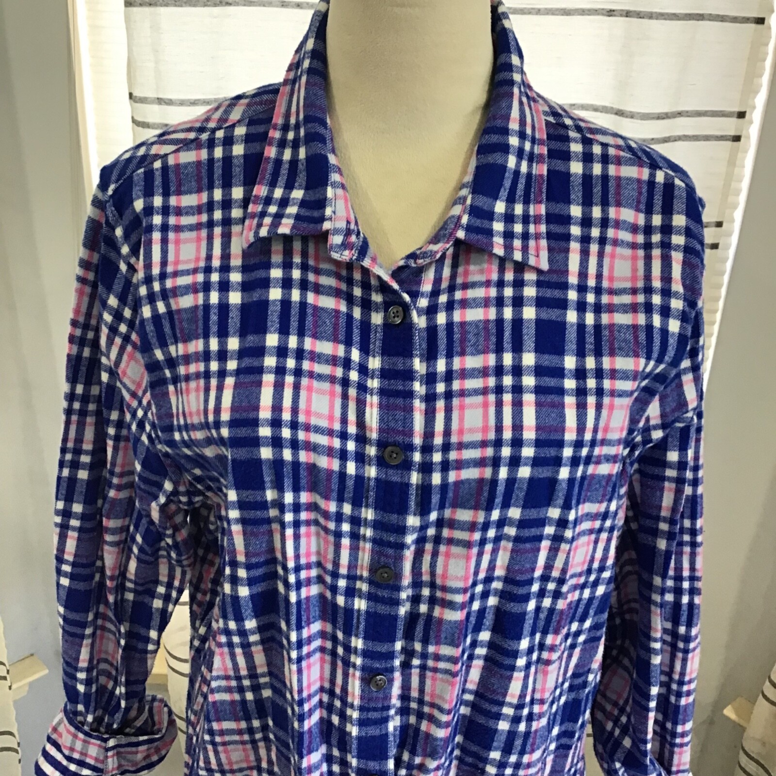 Lands End Women Size 18 Pastel Pink Blue Cotton Soft Front Button Plaid Flannel