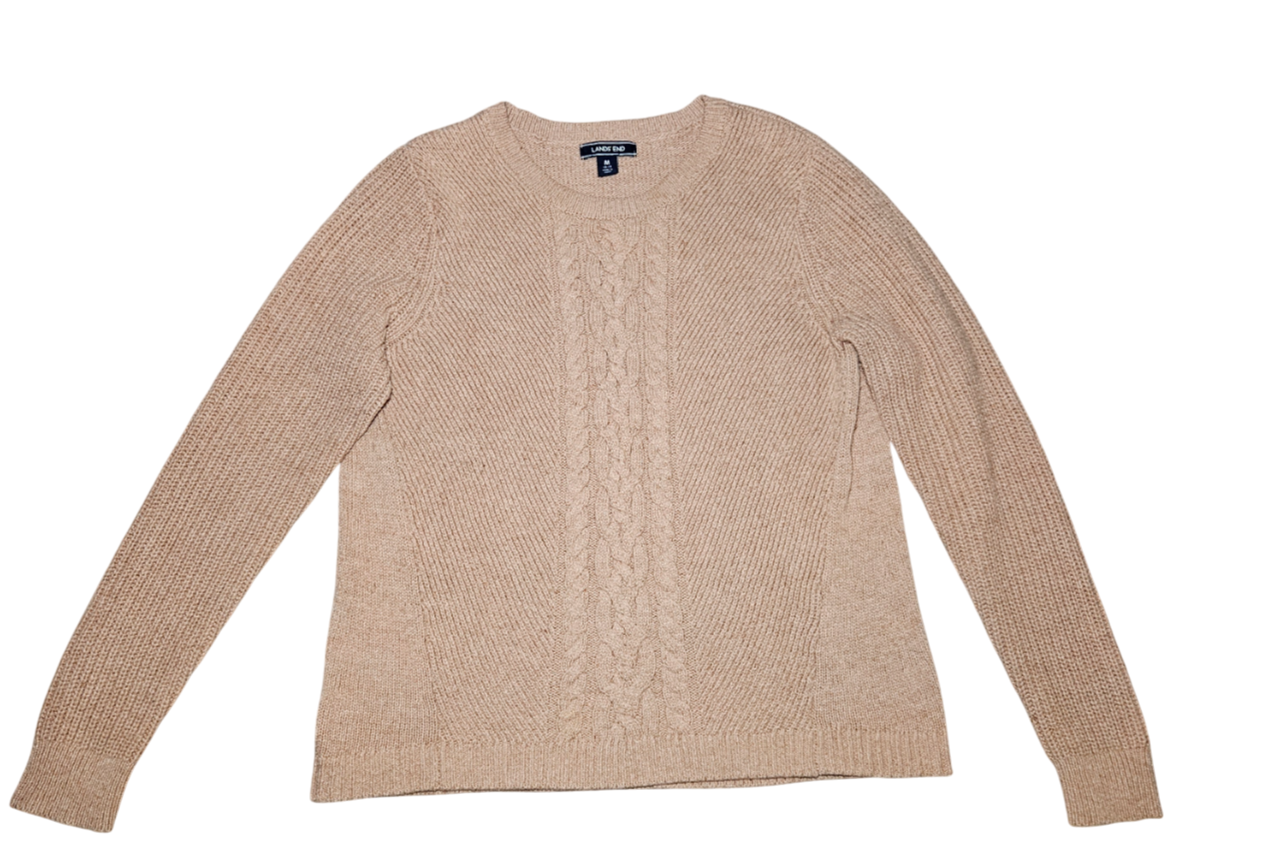 Land's End Womens M Light Brown Fisherman Cable Knit Sweater Preppy Classic - Size M - Light Brown - Chunky Knit - Cable Knit Details - Crew Neck - Long Sleeves - 55% Cotton/ 25" Length/ 20% Nylon Excellent Pre-owned Condition - no holes, rips, cuts or stains. See photos for details. Approximate Measurements - 25" Sleeves - 19.5" Pit to Pit - 25" Front Length - 27" Back Length Smoke Free/ Pet Free Home