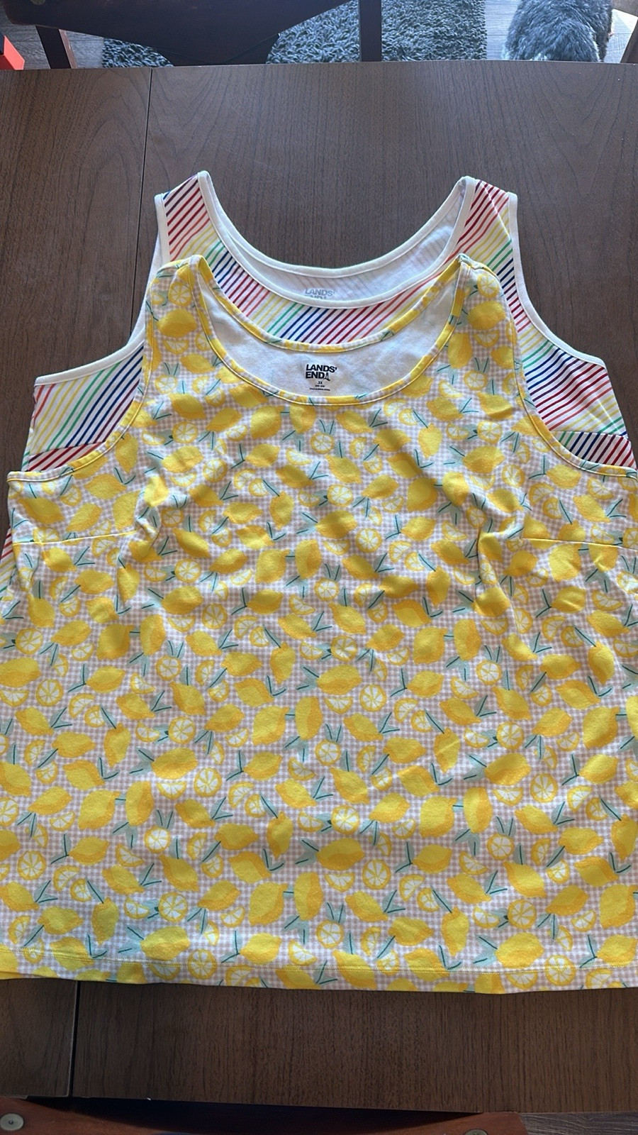 A set of five women's Lands' End tank tops in size 3X. They have a sleeveless design with a round neckline and pullover closure. These casual tops feature a multicolor knit fabric, are machine washable, and come in a regular fit. The tanks are not personalized or handmade, and they are not vintage. Perfect for adding basic style to your wardrobe.