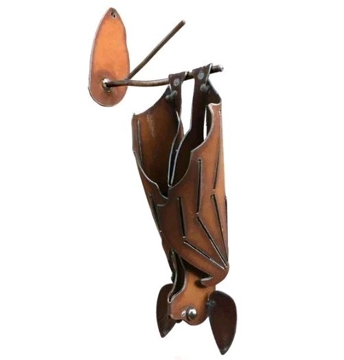 This large-sized, left facing, hanging metal bat sculpture features closed wings, adding a unique touch to any Southwestern, Halloween or nature-themed decor - indoors or out in your garden. Handmade in the United States, this ultra-contemporary piece showcases a rustic, primitive style inspired by Native American and folk art. Bat measuree 14 inches in height, 5" wide, and about 17" total (including mount), this 3D sculpture adds a touch of realism indoors or outdoors with its detailed design. Perfect for those who appreciate contemporary art and the beauty of nature, this one-of-a-kind piece is sure to be a standout in any collection. Left-facing and right-facing orientations describe the direction in which the bat faces once mounted. To choose the direction preferred, you should imagine looking at the surface on which the bat will be mounted. When looking directly at the front of the mounting plate, the hanging bat will face either to the left or to the right.