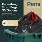 Large Capacity: 30-gallon trash bags provide ample space for household waste and outdoor cleanup Durable Construction: Made from thick, extra-strong plastic for long-lasting use Multipurpose Use: Can be used for kitchen, bathroom, lawn, and outdoor waste disposal Convenient Design: Drawstring closure keeps trash securely contained Easy to Use: Simply open, fill with waste, and tie for quick and easy disposal