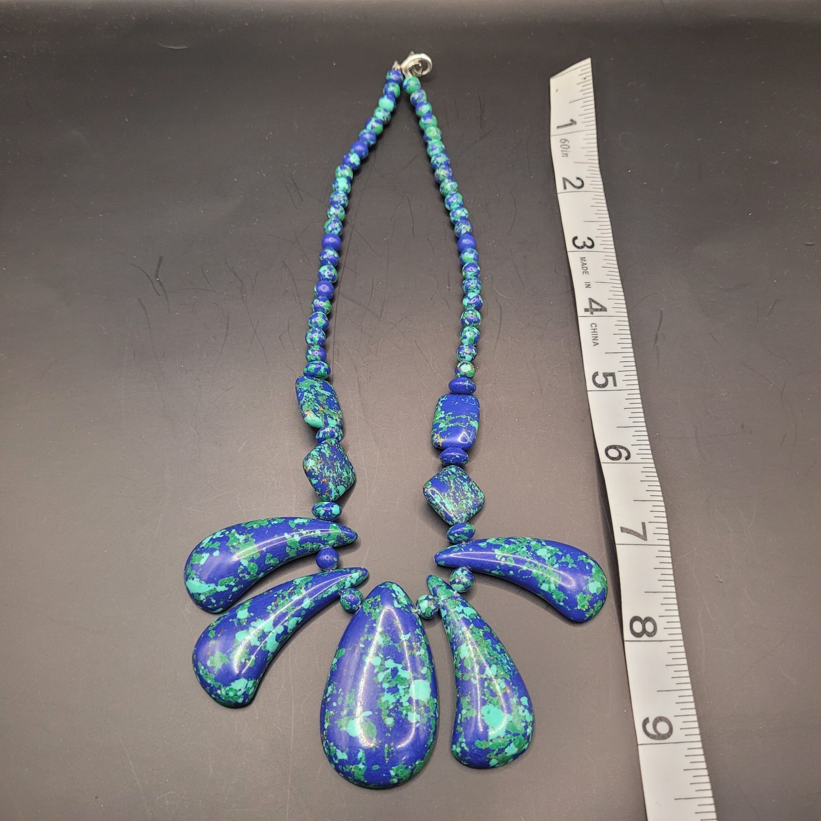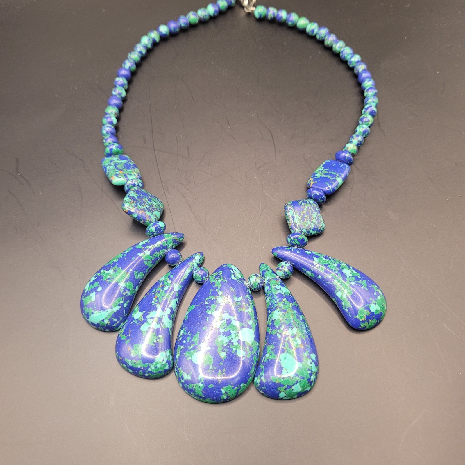 The Large Azurite-Malachite Statement Choker Necklace is a bold and striking accessory perfect for those looking to make a statement with their jewelry. The choker style offers a trendy and modern look that can be easily dressed up or down. The Southwest-inspired design adds a unique and exotic touch to any outfit, making this necklace a versatile and eye-catching addition to any jewelry collection.