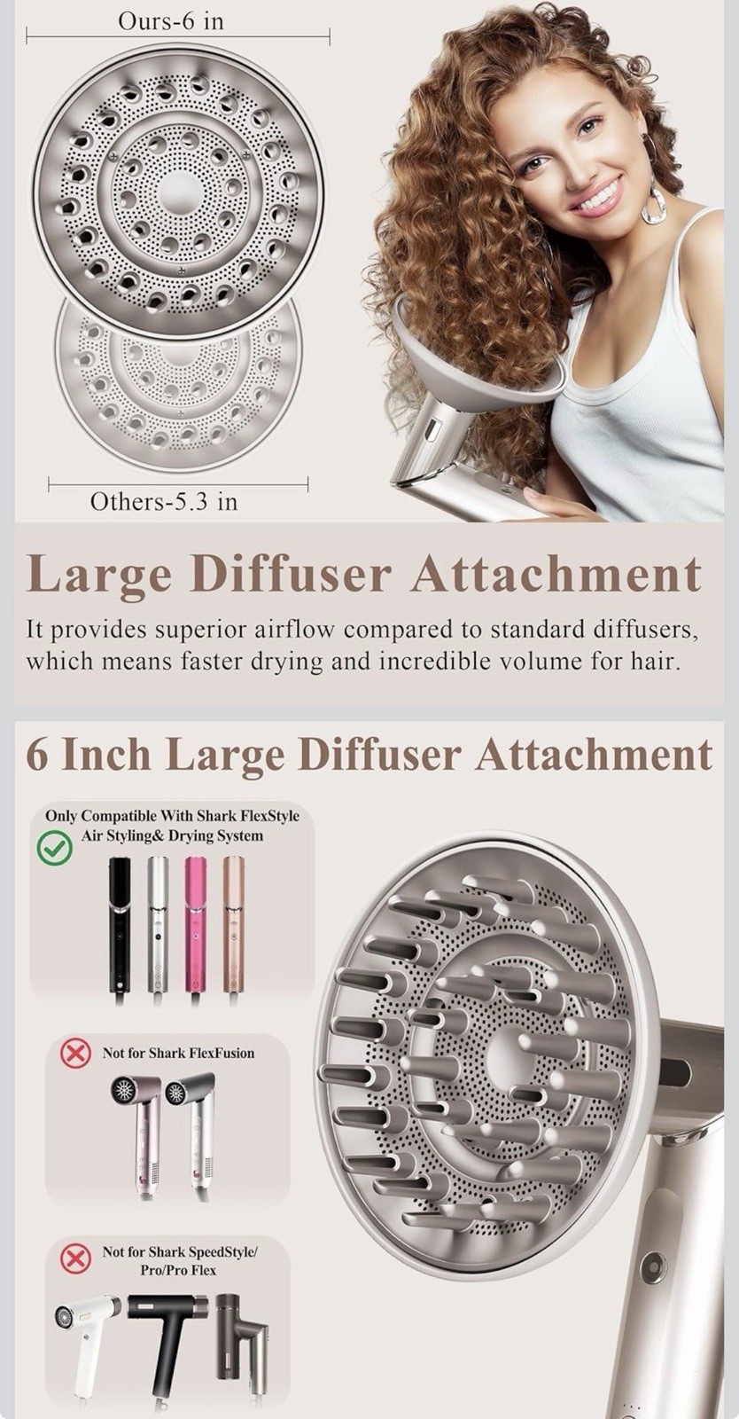 New in open box: Perfect Seamless Fit For Shark FlexStyle HD400 Series: Exclusively designed as Large Diffuser Attachment compatible with HD400, HD430, HD432, HD435, HD440 Model. Please ensure compatibility: NOT COMPATIBLE WITH Shark FlexFusion/SpeedStyle/Pro/Pro Flex Larger Size for Save Your Time: This 6 inches large diffuser attachment is not the same as the regular 5.3 inches diffuser. It provides superior airflow compared to standard diffusers, which means faster drying and incredible volume for hair Extended Prongs: Reach to the roots and add volume to curly hair of any length, allowing you to achieve professional-looking results in less time Salon-Quality Results: Specifically crafted for wavy, curly, and coily hair textures, this diffuser enhances natural curls for defined and bouncy styles, delivering salon-quality results at home No Heat Damage: Even drying from root to tip with no heat damage, ensuring healthier and shinier locks with every use