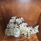 This beautifully crafted vintage bonsai tree features glass flowers and jade-colored leaves, set in a classic celadon porcelain pot. Standing at 14 inches tall and weighing around 7-8 pounds, the tree showcases delicate multi-colored blossoms and fruit-like details. The trunk and branches are wire-wrapped for a realistic look. While the tree is in excellent condition overall, there are two small broken pieces, which are still included and can be reattached. Ideal for collectors of unique Asian-inspired decor.