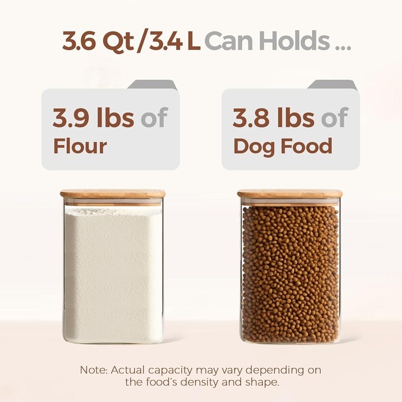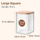 About this item Large Capacity: The large jar, designed with dimensions of 5.9 inches x 8.2 inches and a capacity of 3.6Qt. This shape allows for efficient storage. Experience the convenience of ample storage space while maintaining an organized kitchen pantry. Thickened Glass Jar: Crafted from enhanced 3.3 mm borosilicate glass. The clear construction, coupled with a stylish lids, ensures easy visibility of contents with just a glance. Experience the convenience of effortlessly monitoring your stored items. Wide Mouth Design: Featuring a spacious 5.9" wide mouth for effortless access. Whether you're scooping rice, flour, sugar, or other dry goods, our wide-mouth design ensures convenient retrieval without spills. Easy to Clean: With its wide opening, you can easily reach the bottom of the jar by hand for thorough cleaning. Additionally, we do advise removing the lid before placing the glass jar in the dishwasher and handwashing it separately for optimal care. Versatile Storage Solution: Our storage jars are perfect for a wide range of uses. Whether you’re storing dry goods in the pantry, organizing small items in the bathroom, these jars adapt to any space, adding both function and style to your home. Brand: Color: 3.6Qt-Square-2 Pack Material: Borosilicate Glass Material Feature: BPA Free, Food Grade, Glass, Lead Free, Reusable Capacity: 3.4 Liters