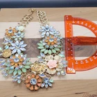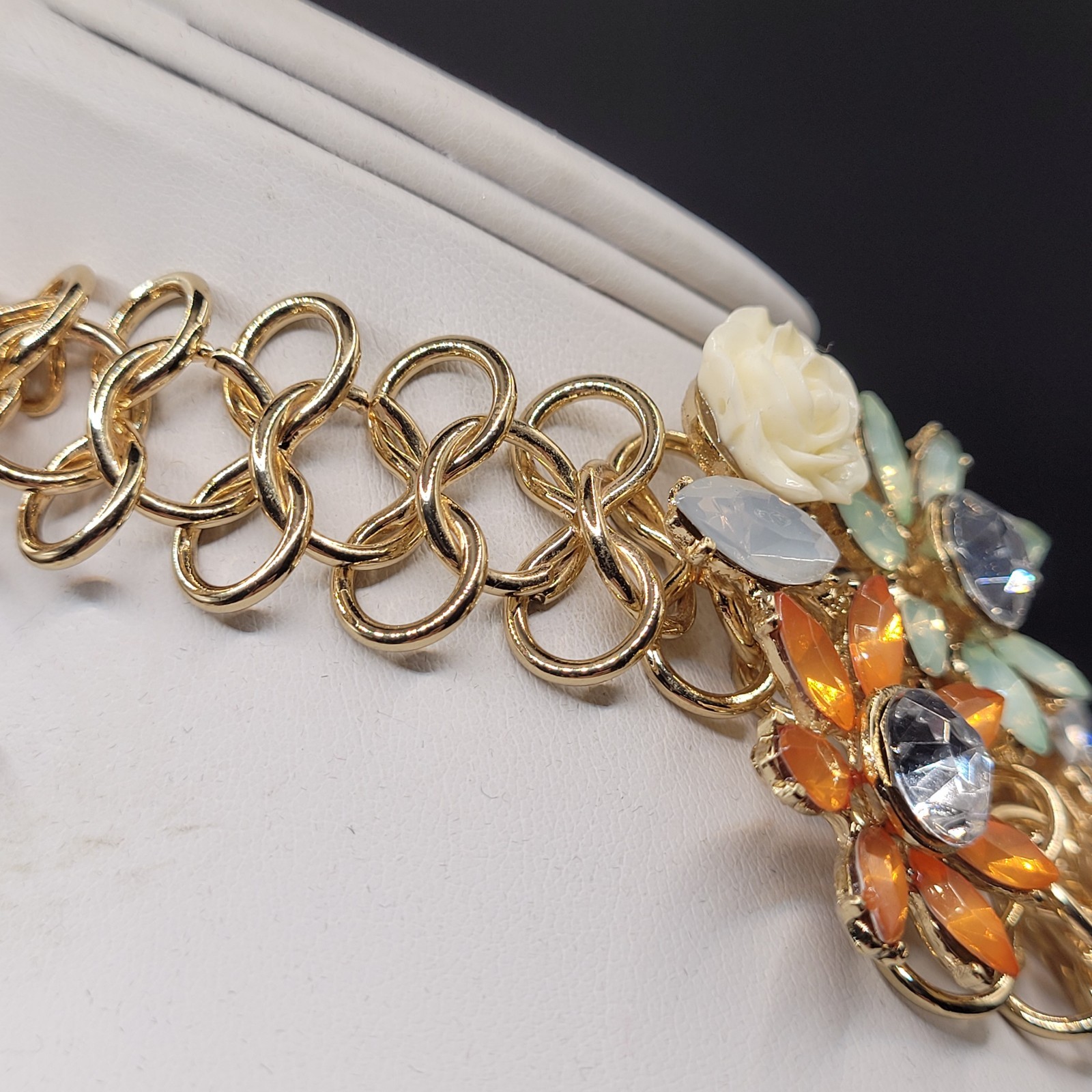 The Large Heavy Floral Pastel Rhinestone and Gold Tone Statement Choker Necklace is a bold and eye-catching accessory that adds a touch of glamour to any outfit. The choker style necklace features a floral design made with pastel rhinestones, set in a gold tone metal setting. The statement piece is sure to make a statement and turn heads wherever you go. Perfect for adding a touch of elegance to a formal occasion or adding a touch of sparkle to a casual outfit.