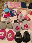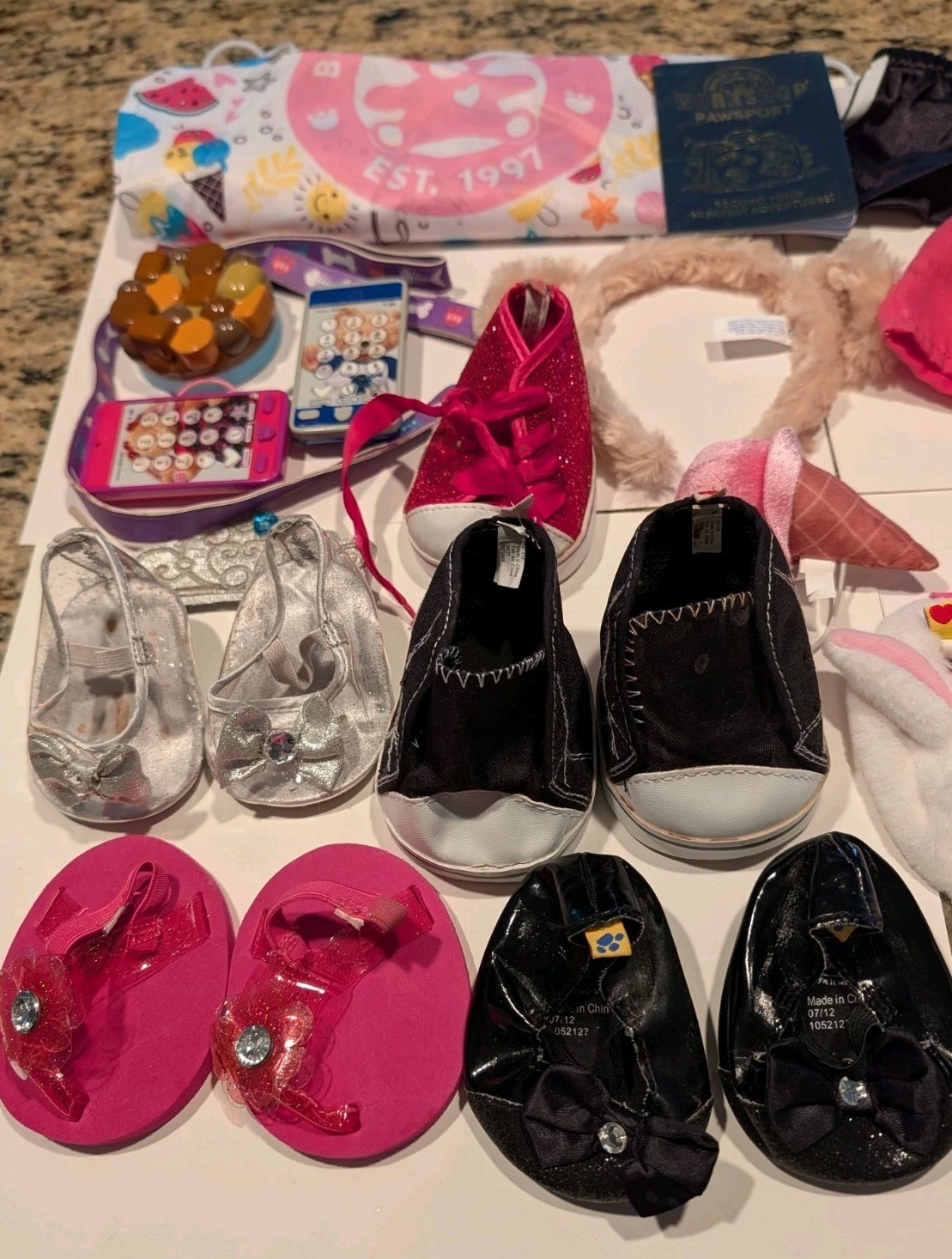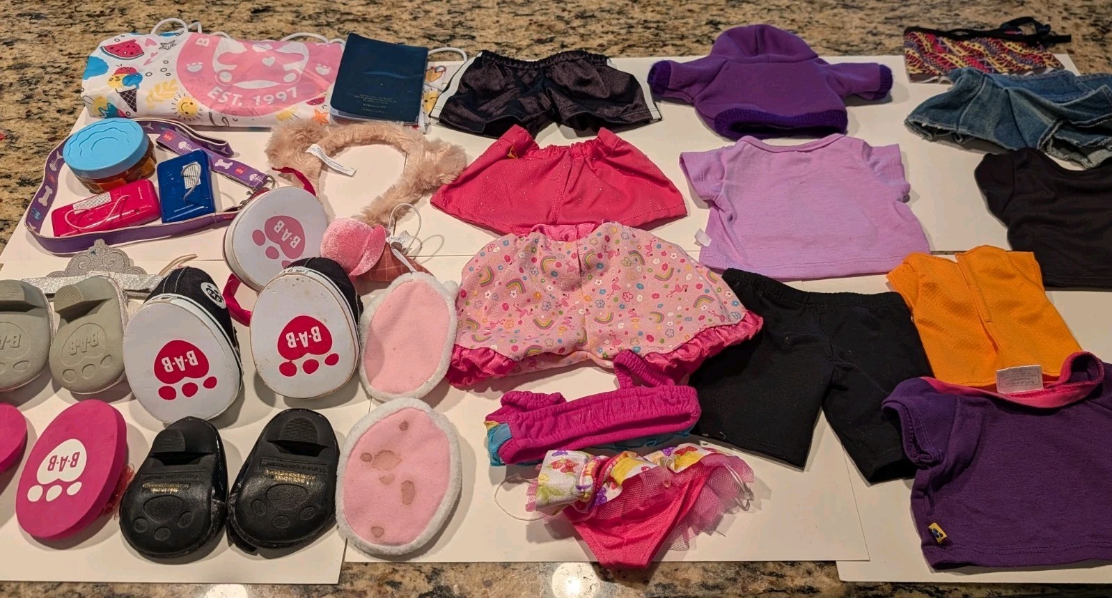 This lot includes a variety of Build-A-Bear clothes, accessories and shoes. The set includes items from Disney and Hello Kitty, as well as other BaB clothing. Perfect for enthusiasts looking to expand their collection with a variety of outfits and accessories. These are in played with condition. A couple of items have stains; bottom of bunny slipper, inside of a silver slipper and top of ice cream cone. There is only 1 red shoe. The 2 play phones work. I took pictures of the front and back of each item. Please let me know if you have any specific questions. I have lots of toy lots. I offer Combined shipping for multiple winning auctions to reduce shipping cost. I think the orange shirt is not BaB. I noticed that it was smaller when I was packing these away after I had posted the listing.