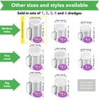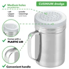 You will receive big stainless steel cooking dredges (14 oz) with handles, metal twist-off lids, and plastic caps; style: medium Medium holes make it a universal shaker for spices, seasonings, as a flour shaker, cinnamon or sugar shaker dispenser Plastic cover will protect from moisture getting inside spice shakers Large size - 14 ounces capacity of seasoning shakers makes is great for your most-used spices and cooking ingredients