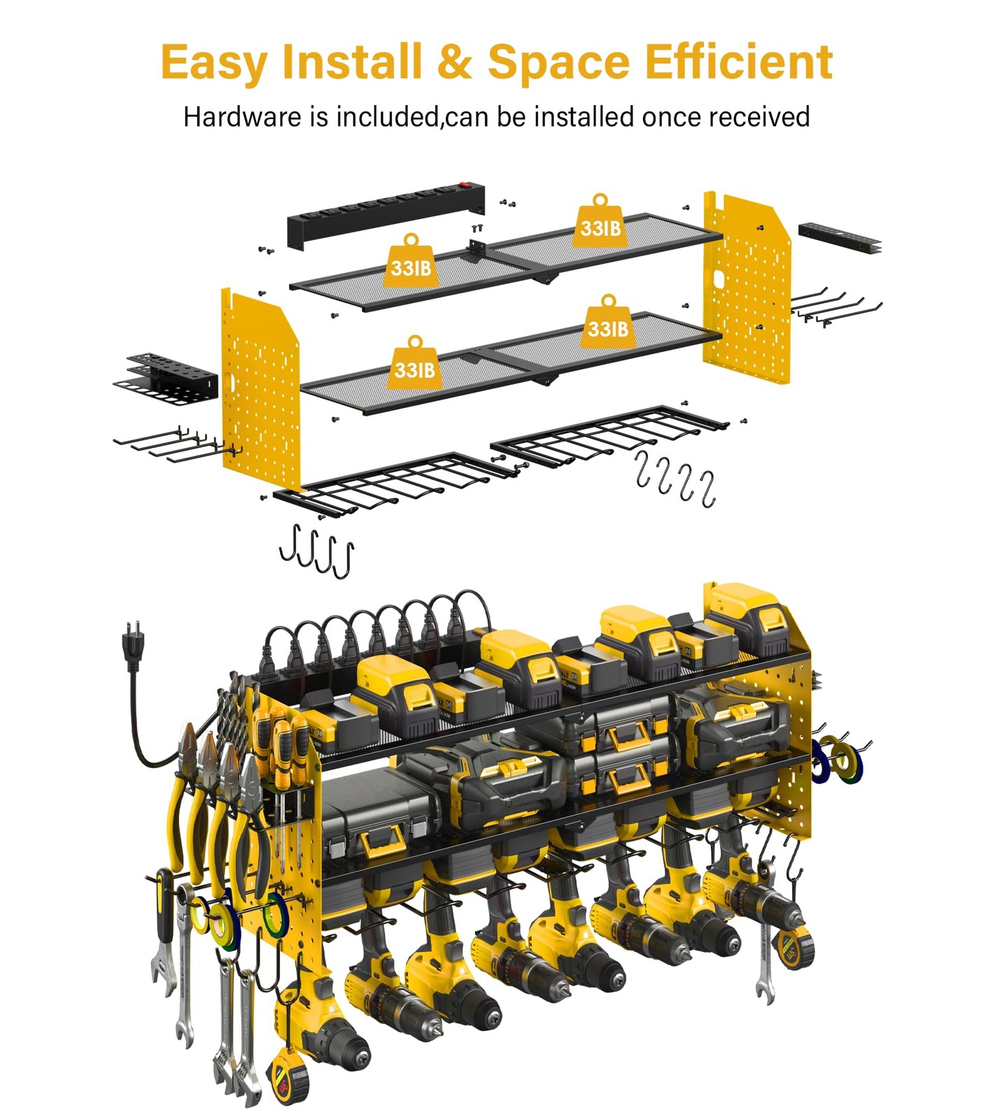 Large Pegboard Power Tool Organizer with Charging Station Large power tool organizer with 8 outlet power strip, three-tier large capacity design allow to store 8 drills on the bottom tier, batteries, chargers and other tools on the top two tiers. Two side pegboard extension comes with 8 long hooks, 8 hooks, and 1 screwdriver organizer rack and 1 magnetic bits organizer. The tool organizer with charging station can turn your tool messy workbench into a tidy and efficient workplace. 8 outlets heavy duty power strip on the organizer makes it easy to charge your tool batteries. Charging station was connected with 6ft 14AWG power cord, equipped with 15A high current, 125V / 15Amp / 1875W. Pegboard design extension fit all standard 0.25in pegboard hooks and accessories. It adds 2 toolboxes on the side, a tool rack for commonly used drills, screwdrivers, pliers, hammers, etc., and a small tool rack perfect for storing screwdriver bits and other accessories. Comes with eight 5.4 inch long hooks and eight hook suspension tools. This wall mount tools battery holder features a three-tier, high capacity design with 32.6 inches of large storage space, big shelf height that offers more space, a 5.27-inch mid-tier tool rack for more charging posts, batteries, and added pliers holders, drill bit storage and magnetic bits rack on the side. Perfect Size: 32.6*8.7*12.8 in. Easy to assemble and hang, it only takes a few minutes to assemble the perfect heavy duty tool holder. The large tools holder made of reinforced and thickened high-quality iron, with strong bearing capacity and durability. Each layer of the grid can support a maximum weight of 66IB. The tools in the picture are only used to show capacity and are not included.