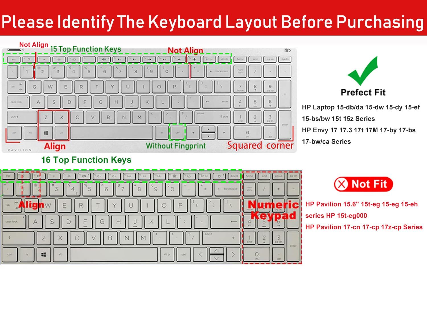 Large Print Keyboard Cover for HP Laptop 15-db/da 15-dw 15-dy 15-bs/bw 15-ef 15t 15z 15.6" 15-db0011dx 15-dy1043dx/dy1051wm 15-dw0037wm/dw1083wm 15-ef1001ds ef1023dx,HP 17-by/bs/ca 17.3 Keyboard Skin COMPATIBILITY: The keyboard cover perfectly for 2020 2019 & 2018 New HP ENVY x360 2-in-1 Laptop 15M-BP011DX 15M-BP012DX 15M-BP111DX 15M-BP112DX 15M-BQ021DX 15M-BQ121DX 15M-CP0011DX 15M-CP0012DX 15M-CN0011DX, 2020 2019 HP Pavilion 15-BS020NR 15-BS020WM 15-BS013DX 15-BW011DX 15-BS113DX 15-BS115DX 15-BW011DX 15-BW069NR 15-BW070NR 15-CB010NR 15-CD040WM 15-CD051NR 15-CD072NR 15-CD075NR 15-CX0030NR 15-DB0011DX 15-CH011DX, 17.3" HP ENVY 17M-AE011DX 17M-AE111DX 17-BS049DX (with SQUARED Keypad). ✖✖[NOT FOR 15.6 HP Pavilion 15-EG 15-EH Series]✖✖ NOT FOR HP Pavilion 15.6" 15t-eg 15-eg 15-eh series HP 15t-eg000 15-eg0073cl 15-eg1073cl 15-eg1053cl 15-eg0050wm 15-eg0070wm 15-eg1010nr 15-eg0021nr 15-eg0025nr 15-eg0032nr 15-eg0072nr 15-eg0076nr 15-eg0103tx, HP 15-eh1085cl 15-eh1075cl 15-eh1010nr 15-eh0085nr 15-eh0095nr 15-eh1070wm 15-eh0050wm 15-eh0090wm. HP Envy X360 15.6 keyboard cover is made with premium soft-touch silicone material, soft and flexible, healthy and environment friendly. HIGH-CONTRAST LARGE PRINT: Latest design with special LARGE PRINT letters, can make the letters more vivid and eye-catching, the high-contrast keys can really help those who have trouble seeing keyboards, make it easier to see and tyep faster, perfect for the people such as elderly, visually impaired, game lovers, beginners, office staff, students, kids, and so on. HP Laptop 15 keyboard skin is with ultra thin 0.13mm thickness to minimize typing interference, smooth and elastic silicone material gives you a pleasant typing experience. A perfect Christmas gift deal for your family and friends. FULL PROTECTION FOR KEYBOARD: HP Envy 15.6" keyboard skin cover is with high precision and one step shaping, each key & symbol are individually molded and specially printed on silicone for a long lasting professional look, perfectly fit for each keys with all-around protection. WATER-RESISTANT & DURABLE: HP Laptop 15 accessories is waterproof, dustproof, protects your laptop against spills, dust, and other contaminants, wearproof, good permeability, easy to wash and reuse. COMPATIBILITY: The keyboard cover perfectly for 2020 2019 & 2018 New HP ENVY x360 2-in-1 Laptop 15M-BP011DX 15M-BP012DX 15M-BP111DX 15M-BP112DX 15M-BQ021DX 15M-BQ121DX 15M-CP0011DX 15M-CP0012DX 15M-CN0011DX, 2020 2019 HP Pavilion 15-BS020NR 15-BS020WM 15-BS013DX 15-BW011DX 15-BS113DX 15-BS115DX 15-BW011DX 15-BW069NR 15-BW070NR 15-CB010NR 15-CD040WM 15-CD051NR 15-CD072NR 15-CD075NR 15-CX0030NR 15-DB0011DX 15-CH011DX, 17.3" HP ENVY 17M-AE011DX 17M-AE111DX 17-BS049DX (with SQUARED Keypad). ✖✖[NOT FOR 15.6 HP Pavilion 15-EG 15-EH Series]✖✖ NOT FOR HP Pavilion 15.6" 15t-eg 15-eg 15-eh series HP 15t-eg000 15-eg0073cl 15-eg1073cl 15-eg1053cl 15-eg0050wm 15-eg0070wm 15-eg1010nr 15-eg0021nr 15-eg0025nr 15-eg0032nr 15-eg0072nr 15-eg0076nr 15-eg0103tx, HP 15-eh1085cl 15-eh1075cl 15-eh1010nr 15-eh0085nr 15-eh0095nr 15-eh1070wm 15-eh0050wm 15-eh0090wm. HP Envy X360 15.6 keyboard cover is made with premium soft-touch silicone material, soft and flexible, healthy and environment friendly. HIGH-CONTRAST LARGE PRINT: Latest design with special LARGE PRINT letters, can make the letters more vivid and eye-catching, the high-contrast keys can really help those who have trouble seeing keyboards, make it easier to see and tyep faster, perfect for the people such as elderly, visually impaired, game lovers, beginners, office staff, students, kids, and so on. HP Laptop 15 keyboard skin is with ultra thin 0.13mm thickness to minimize typing interference, smooth and elastic silicone material gives you a pleasant typing experience. A perfect Christmas gift deal for your family and friends. FULL PROTECTION FOR KEYBOARD: HP Envy 15.6" keyboard skin cover is with high precision and one step shaping, each key & symbol are individually molded and specially printed on silicone for a long lasting professional look, perfectly fit for each keys with all-around protection. WATER-RESISTANT & DURABLE: HP Laptop 15 accessories is waterproof, dustproof, protects your laptop against spills, dust, and other contaminants, wearproof, good permeability, easy to wash and reuse. Shipping from the USA All of our products are shipped from the USA, ensuring quick delivery to your destination. Payment We offer the following payment methods: PayPal, credit card, bank transfer, and eBay's secure payment system. Free Shipping & Free Returns Shipping within the USA is FREE. Additionally, any return is absolutely free for you. Risk-Free Purchase You have the option to return an item within 30 days without any justification. We cover the return shipping costs! Fast Shipping We ship immediately upon receipt of payment. Generally, the package is delivered within 2-3 days in the USA. If it takes longer, we will contact you. Quality and Costs Made in Europe, USA, China No customs fees or additional charges Total satisfaction guarantee Invoice with declared VAT available upon request in .pdf format Feedback Your feedback is very important to us. After you pay for your purchase, you will automatically receive positive feedback from us.