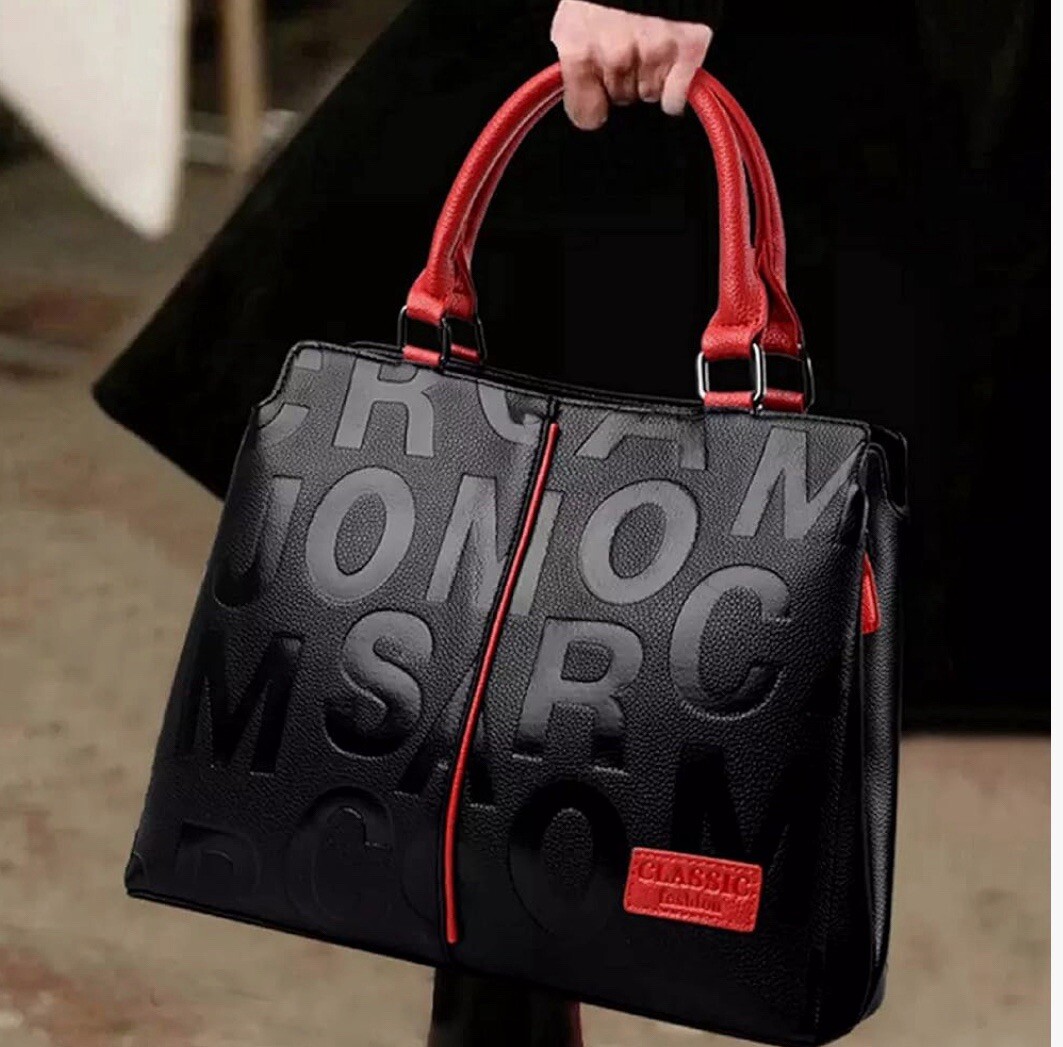 A stylish large tote bag in red and black with a crossbody strap. It features a zip closure, gold hardware accents, a coated finish, and a logo pattern. The bag is made of faux leather with a rayon fabric lining in red. It has inner and outer pockets, inner dividers, and an adjustable shoulder strap. Perfect for travel, casual outings, workwear, or business use.