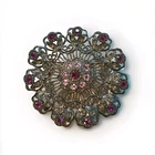 Add a touch of Victorian elegance to your outfit with this stunning large round brooch. The intricate filigree design scrollwork beautifully complements the shimmering purple rhinestones, making it a perfect accessory for any occasion. The brooch is made of high-quality materials, ensuring its durability and long-lasting use. Its shape is perfect for easy wearing and it will make a great addition to any jewelry collection.