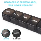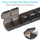 XL Large Capacity Weekly Pill Case Why do you need a pill organizer? The portable pill dispenser is designed for organizing one week’s pills or tablets.It would remind you to take the right medication and the right dose at the scheduled time, to effectively avoid taking the wrong medication or missing the time,let you say goodbye to the trouble of distinguishing pills,and save your time and energy. Who need our pill organizer? 1) People under multiple medications 2) People with memory issues 3) Elderly people 4) People who need to take vitamins everyday 5) Fitness people Easy to Open & Close Pill Box The lids are easy to open & close, won't pop-open and dump pills out. After being locked, it will remain closed, and the secure buckle will ensure that your pill will not slip out. Easy to open even for elderly or arthritis patients. Small in Size, Large in Capacity 7 ultra large compartments, each one is roomy to hold 12 fish oils or 18 vitamins,Overall size:9.56"x 1.77"x 1.1", Each slot size:1.55" x 1.24" x 0.9". Built To Last Printing guarantees up to 10,0000 times of use without wear to tear. Printing has passed the 3M Adhesives & Tapes test ,No worries about the labels weared off easily so that you couldn't distinguish the date. Specification BPA-Free Material:Our Large weekly pill container is made of food-grade polypropylene plastic,safe for medical use. Warning This product is neither child resistant nor is it a toy. Keep this and all medicine out of a child's reach. Caution Softly clean with cold water before your first usage. Do not wash with a dishwasher. Keep the pill separator away from high temperatures and humid environments. Portable Size:XL Large Capacity Pill Dispenser, Every daily slot can hold up to 12 large fish oils or 18 vitamins,enough space for filling and sorting all your pills for the entire week, help you to easily plan and distribute your daily doses,Small and portable size, perfect for your travel or on-the-go,Overall size:9.56"x 1.77"x 1.1", Each slot size 1.55" x 1.24" x 0.9". BPA Free Materials:pill holder are made of food grade plastic, safe for medical use. Upgraded Easy Open Design:Push Opening Design,Makes pill organizer easy to open and medication easy to retrieve,Ideal for elderly patients with arthritis, the pill container will stay closed once locked and securely snap will keep your pills safe all the way. Built to Last:Printing has passed the 3M Adhesives & Tapes test ,No worries about the labels weared off easily so that you couldn't distinguish the date.Compared to other pill case, these pill container are more durable. What You Receive: 2 x pill box, our 12-month warranty, and friendly customer service.