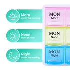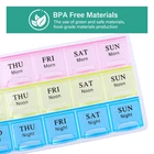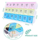 PERFECT PLANNER: The organizer allows you to plan your 7 day medication for morning, lunch and night. It helps you make sure that you haven't missed any dose,size :8.5"x4.2"x0.7"Colorful THE COVER IS DETACHABLE:easy to clean with water, easy to remove and install. If the cover is accidentally trapped in the slot, the cover can be removed and re installed, which will not affect the use. EASY TO READ BOLD LETTERS: You'll love the bold easy to read daily & weekly lettering on the monthly pill organizer holder allowing you to easily find and allocate your medications for an entire month. When it comes to your medication organizer we want to make sure you avoid mixing up medication when taking your pills of the day. EXCEPTIONAL DESIGN: The pill organizer has a contoured design, with one side round bottom for easy pill removal ,for easy pill removal. It includes 21 large compartments and lets you store medicines in bulk. The box comes in bright and attractive colors. VERSATILE: Our pill organizer can store your pills,vitamins,supplements,candy,Curved needle,even your earrings and so on