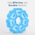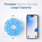 💊Large Capacity Medicine Organizer - Overall size: 5 x 5 x 1 inches, 7 slot, each slot size: 1.3 x 1.2x 0.9 inches, each can perfectly hold 7 fish oil/9 vitamins/20 capsules, easy to dispense every day. 💊BPA-Free Materials - This pill container is made of food-grade PP plastic, with excellent durability and sturdiness, not easy to damage and break, BPA-Free, can safely store your medication. 💊Easy Open Design - Easy to open and close, friendly to the elderly, kids or arthritis. after being locked, it will remain closed, and the secure buckle will ensure that your pill will not slip out. 💊Upgraded Printing Technology - The date is more clearly and explicitly marked, not easy to fall off, so you can more easily distinguish and view, can be used up to 100000 times. 💊Customer First - is committed to customer experience, if you have any questions, we provide 24-hour online after-sales service.