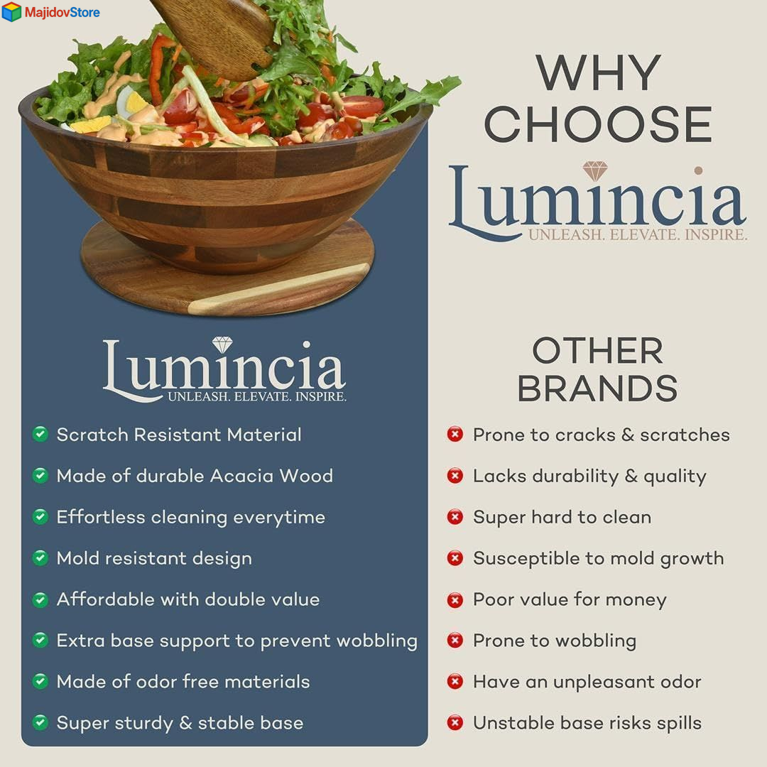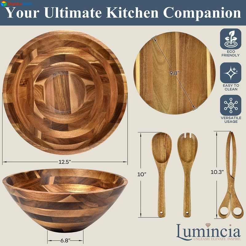 Large Wooden Salad Bowl Set – Premium Acacia Wood Serving with Brown Description Features: 【Premium Quality】 Our Large Salad Bowl is made up of Premium solid acacia wood - durable, food-safe, and naturally resistant to water, stains, and odours – Our salad bowl set meets natural durability 【Bowl Set】Our Wooden salad Bowl contains 5pcs Set – Our salad bowl contains 1 large serving bowl with base plate and Wooden Salad Servers or a serving utensil set - salad serving bowl includes everything 【Spacious 12.5-inch】Our wooden fruit bowl Designed for family meals and festive gatherings – Our spacious Handcrafted elegance wooden salad bowl comes with elegant matching servers 【Healthy & Easy to Clean】 Protected with a food-grade oil finish - Our wooden salad bowl set feature a smooth, waterproof surface that gentle on food and easy to maintain 【Caring Made Simple】 Hand wash gently and dry immediately to maintain the wood salad bowl’s natural beauty - Avoid soaking, dishwashers, microwaves, and refrigeration for lasting durability Product Details: Bowl Material: Acacia Wood Number of Pieces: 5 Brand: Lumincia Color: Brown Style: Classic Handling We will ship all orders within 2 business day of payment. Delivery We Do Not Ship Outside of the Continental US. Return Policy All items qualify for returns within 30 days of receipt. Buyer is responsible for return shipping on any item that is not damaged. Feedback We take our reputation seriously, we buy and sell online, so we understand the value of trust. If you are unsatisfied with your order, please contact us and we will work with you to resolve it to your satisfaction.