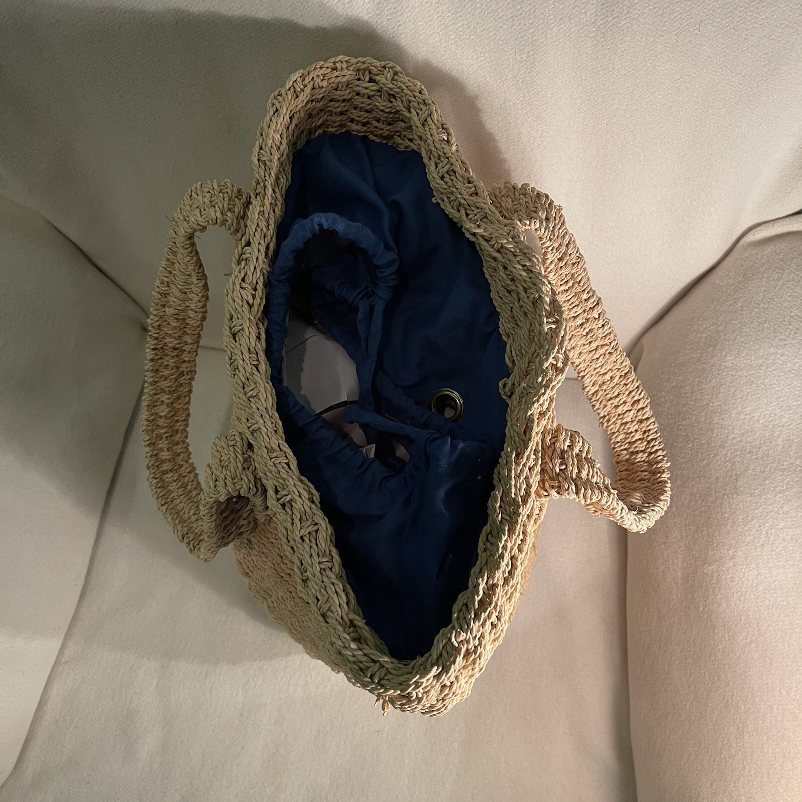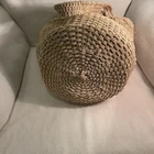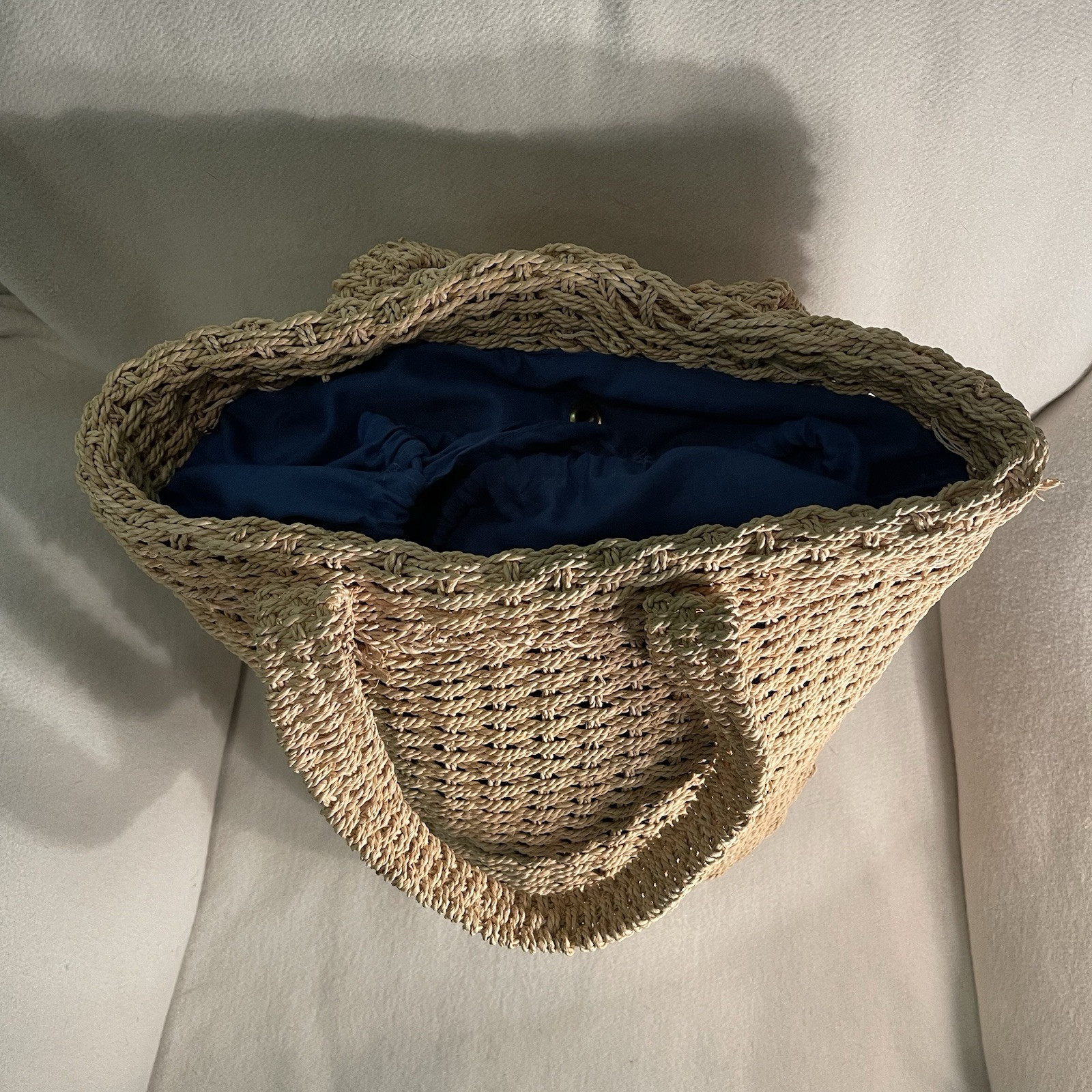 This Large Woven Jute Market Bag is a stylish and practical choice for travel or casual outings. The round-shaped bucket tote features a drawstring closure and double handles with a comfortable 8.5" drop in tan color. The exterior is made of durable jute material with a vintage look, while the interior is lined with blue cotton for added durability. With a size of 10" width and 12" height, this tote offers ample space for all your essentials and is perfect for the environmentally conscious woman looking for a chic accessory. Excellent preowned condition.