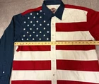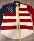 Larro Shirts men’s XL long sleeve western pearl snap shirt with an American flag colorblock design and embroidered stars on the navy yoke. 100% cotton. New with Cavender’s tag attached. Top to bottom 31-32” Pit to pit 24” Shoulder to Shoulder 21” Sleeve length 26”