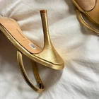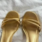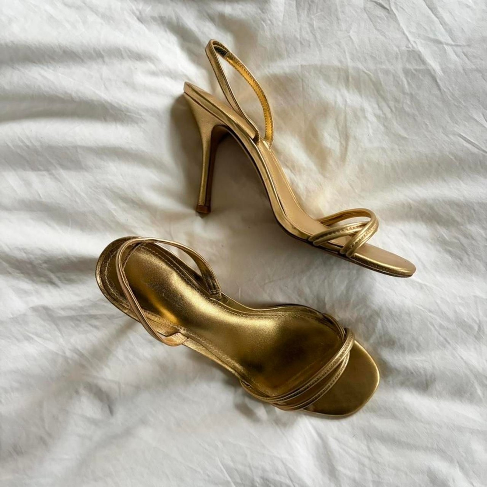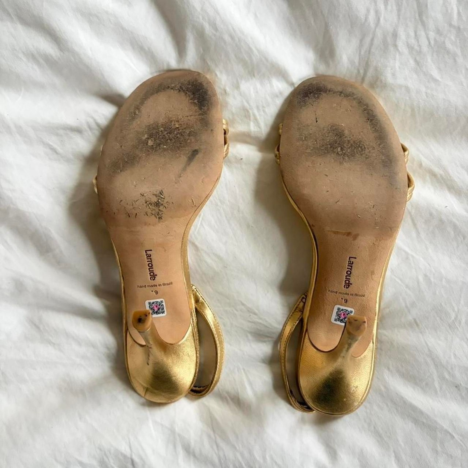 Larroude Annie open-toed sandal in gold metallic leather. Minimalist, 3.8 inch stiletto heels. Perfect for weddings, parties. In good used condition, with some minor blemishes on heels as shown. Size 9.