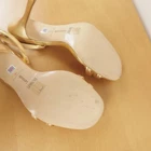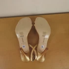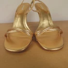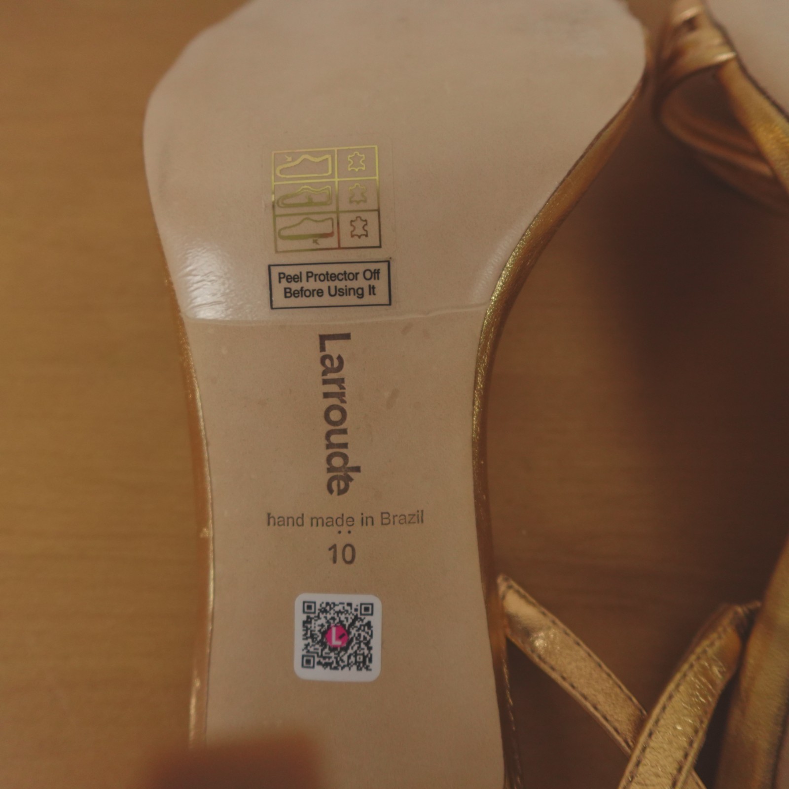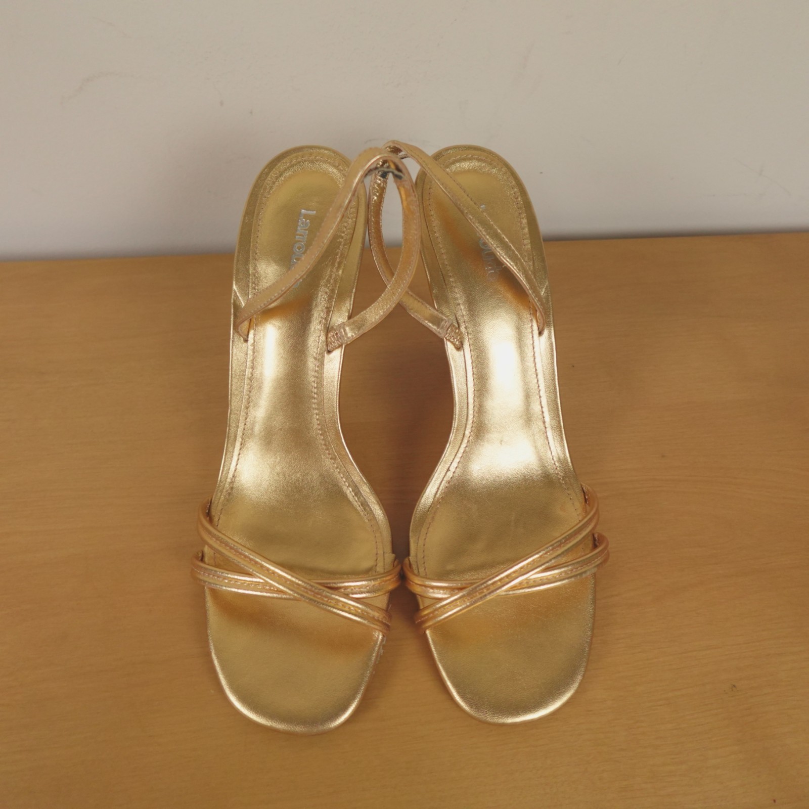 Larroude Heels Womens 10 Gold Metallic Leather Annie Sandal Slingback. Original MSRP of $315. Excellent like new condition, still has the bottom sole plastic protector in place as pictured, no stains, tears, or signs of wear noted, please review all photos. See photos for measurements. If we missed something, don't worry, we offer free returns. Just indicate, "just didn't like it," for any reason, and we'll pay for the return. Thanks for visiting!