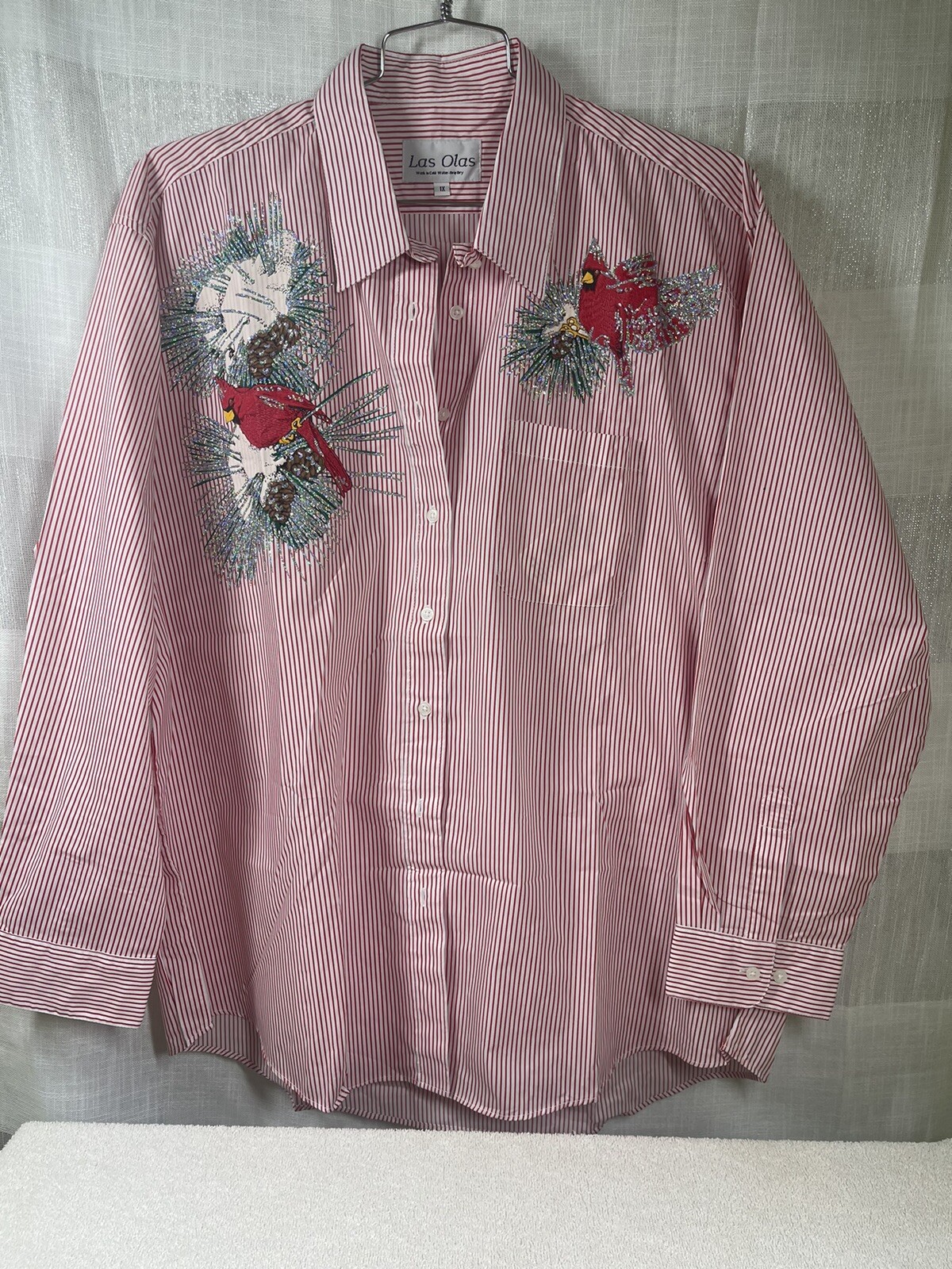 This two-piece shirt set is perfect for the holidays! The festive pinstripe design looks sharp, and the 1XL size fits comfortably. Great quality and style—makes an awesome gift for any occasion. Love the cardinal Christmas touch!