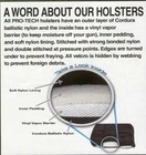 Visit My eBay Store: D&T Holster Store 60 day Money Back Guarantee If for any reason your satisfaction is not complete you may return the item and we will gladly give you a refund for that item. We believe in the quality of Pro-Tech Holsters, that is why we offer a 60 Day Money Back Guarantee. Model # WIP-MLZ Pro-tech Small of the Back Gun holster DESCRIPTION: Small of the back Nylon gun holster for Taurus 38 Special (5 Shot) With Laser by Pro-tech holsters. This specially designed gun holster isn't tapered like most gun holsters - and will accommodate many different configurations of pistols. It easily clips onto a belt or your pants (belts up to 1 3/4 inch wide). The outer layer is cordura ballistic nylon, and the inside has a vinyl vapor barrier to keep moisture off your gun so it will not Rust. It's made of durable black nylon w/black nylon stitching and the inside has a soft padding to protect your guns finish and it's adjustable so the holster can be worn on the left or right side - for left or right-hand draw. Gun Holster Features inside has a vinyl vapor barrier to keep moisture off your gun so it won't Rust. - Adjustable for right or left-hand draw. - Gun holster can clip onto your belt - Made of durable nylon with padding. - Pro-tech holsters brand. Jesus is the way, the truth and the life! When you follow Him you’ll be blessed beyond measure! God says that He will give you abundantly more than you can even ask for or imagine. He really wants to bless you! You’re His child, He loves you so much! John 14:6 God Bless Size Chart Make Model AMT Autos "Backup" .380 ACP,22LR 2 1/2 20 20 20 20 "Backup" .45 3 3 3 3 3 Skipper 4 7 7 7 7 Hardballer .45 5 15 15 15 15 Hardballer .45 Longslide 7 35 35 35 Lightning .22 5 15 15 15 Lightning .22 6 1/2 35 35 35 Automag II .22 WMR 3 3/8 3 3 3 3 Automag II .22 WMR 4 1/2 8 8 8 8 Automag II .22 WMR 6 21 21 21 21 Astra Autos Constable, Camper, Falcon 3 1/2 - 4 7 7 7 7 A-70M, A-75 3 1/2 33 33 33 33 A-80, A-90, A-100 3.35 3 3 3 3 Revolvers All Double Action 3 12 12 12 All Double Action 4 12 12 12 All Double Action 6 14 14 14 14 6" 14 All Double Action 8 1/2 16 16 16 16 8" Auto Ordance Autos Pittbull 3 1/2 8 8 8 8 General 4 1/2 8 8 8 8 1911 A1 5 15 15 15 15 Bersa Autos 380 3 20 20 20 20 Bersa Bersa Beretta Autos Autos Autos Thunder 40,45 Thunder 40,45 20, 21,32, 950 Series 3 1/2 4.3 2 1/2 3 7 1 3 7 1 3 7 1 3 7 1 Tomcat 2 1/2 1 1 1 1 34, 70S, 70SP, 81, 82, 82B, 84, 84B, 84F, 85, 85B, 85F, 86, 87, 90, Puma, Jaguar 3 1/2 - 3 3/4 33 3 33 3 76P, 76W, 89 5 - 6 21 21 21 21 92, 92S, 92SB, 92D, 92F, 92G, 96, 92FS, Brigadier 5 8 8 8 8 92FC, 92 Centurionm 96 Centurion, 92D Centurion, 96D, Centurion 4 1/4 8 8 8 8 92SBC, 92FM 4 1/2 8 8 8 3 3 8000, 8040 Cougar, 9000 3 1/2 33 3 33 3 8 Browning Autos BDA .380 3 3/4 3 3 3 3 Micro Buck Mark/Buck Mark Plus, Challenger, Nomad 4 - 4 1/2 8 8 8 8 Hi-Power 9MM, L40 4 5/8 15 15 15 15 BDM 9MM, BPM-D, BRM-DOA 4 3/4 8 8 8 8 BDA 9MM, .38 Super, .45 ACP 4 1/2 8 8 8 Buck Mark .22, Challenger, Nomad 5 1/2 21 21 21 Colt Autos Mustang, Mustang Plus II, Mustang Pocketlite 2 3/4 20 20 20 Officers ACP .45, DBL Eagle Officers .45, 1991 A1 Compact 3 1/2 3 3 3 3 380 Government Model, Government Pocketlite 3 1/4 20 20 20 Challenger, Huntsman, Woodsman, Sport, Cadet 4 1/2 7 7 7 7 Commander, Combat Commander, Lightweight Commander, 1991 A1 Commander 4 1/4 8 8 8 8 Combat Elite, Delta Elite, Government Model, Gold Cup, Combat Target, 1991 A1 5 15 15 15 15 Huntsman, Targetsman, Woodsman, Challenger 6 21 21 21 Revolvers Agent, Cobra, Commando, Detective SPL, Lawman, DSII/38 SPF VI 2 - 3 11 11 11 Commando, Lawman, Official Police, Marshall, Metropolitan, King Cobra, Peacekeeper, Python, Three-Five-Seven, Trooper 4 12 12 12 Diamondback 4 12 12 12 Officers Model, King Cobra, Peacekeeper, Offiicial Police, Python, Three-Five-Seven, Trooper 6 4 4 4 6" Diamondback 6 14 14 14 14 6" Anaconda, New Service 6 14 14 14 14 6" Python, Trooper 8 16 16 16 16 8" Anaconda, New Service 7 1/2 - 8 16 16 16 16 8" Frontier Scout, New Frontier, Peacemaker, Single Action Army 4 3/4 12 12 12 12 12 New Frontier, Single Action Army, Peacemaker 5 1/2 23 23 23 New Frontier .22, Peacemaker, Single Action Army 7 1/2 16 16 16 16 Whitetailer 8 16 16 16 16 CZ Autos CZ83 3 1/2 3 3 3 3 CZ Autos CZ75 Compact 40,9mm,CZ40P CZ P-01 Bobcat 3 .9 7 7 7 7 CZ75,SP-01,CZ75 B,CZ75 BD 4.5 8 8 8 8 Daewoo (Firstshot INC.) Autos DP52 (Walther), PH380 3 3/4 20 20 20 20 DP51 9mm 4 3 3 3 3 DH40 4 3 3 3 3 Daisy Airguns 57 4 780, 790, 1200 4 - 6 O8, P38, 59 4 - 5 European American Army (EAA) Autos European .22, .380, .32 3.2 3 3 3 3 Witness Subcompact, FAB92 3.66 7 7 7 Witness, Witness Sprot, Witness Combo, RAB92 4.7 15 15 15 15 Revolvers Windicator 2 2 2 2 2 Windicator 4 10 10 10 Windicator, Windicator Target 6 14 14 14 14 6 14 Small Bore Bounty Hunter, Big Bore Bounty Hunter 4 3/4 - 5 14 14 14 14 6 14 Small Bore Bounty Hunter 6 14 14 14 14 6 14 Big Bore Bounty Hunter 7 16 16 16 16 8 Small Bore Bounty Hunter 9 17 17 17 17 10 Freedom Arms Revolvers 454 Casull 4 3/4 23 23 23 454 Casull 7 1/2 27 27 27 454 Casull 10 17 17 17 17 Glock Autos 19, 31, 32,33,38, 4 7 7 7 7 17, 22, 31 4 1/2 7 7 7 7 20, 21 4 1/2 8 8 8 8 23,29, 30,36 3 3/4 33 33 33 33 26, 27, 39, G28 3 1/4 3 3 3 3 34, 35 5.32 21 21 21 21 H & K Autos P7, P7M8, P7M10, P7M13,P30,45C 4 7 7 7 7 USP Tactical 5.09 8 8 8 8 USP Tactical 4.78 8 8 8 8 Harring-ton & Ri-chardson Revolvers 504, 525, 532, 622, 632, 642, 732, 733, 826, 829, 830, 832, 833, 900, 901, 922, 925, 929, 930, 970 2 1/2 - 3 11 11 11 504, 525, 532, 586, 622, 642, 686, 732, 733, 900, 901, 904, 905, 922, 925, 926, 929, 930, 980, 999 4 - 4 1/2 12 12 12 504, 986, 603, 604, 649, 650, 686, 900, 901, 903, 904, 922, 929, 930, 939, 940, 949, 950, 999 5 - 6 14 14 14 12 12 6 12 586, 649, 686, Plus Other Double Action, 586, 686 7 - 8 16 16 16 16 8 10 17 17 17 17 Hi_Point Autos 9mm Compact, .380 Compact 3 1/2 33 33 33 9mm, .40, .45 4 1/2 8 8 8 High Standard Autos Victor 4 1/2 15 15 15 Victor; OLYMPIC;
