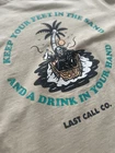 The Last Call Co. Men's T-Shirt is a beige cotton shirt in size Medium, featuring a regular fit and short sleeves. The design "Keep your toes in the sand, and a drink in your hand" adds a casual and laid-back vibe to the shirt, making it perfect for relaxed summer days. Made from comfortable cotton material, this T-Shirt is a versatile wardrobe staple for men looking for a comfortable and stylish option for everyday wear. There is a small bleach spot on the sleeve/shoulder. It’s very light