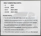 Navigation SD Card Latest Version GPS Maps Compatible with 2024 CX-30/3, 2024-2025 CX-5, 2023-2025 CX-90, USA/CAN/MEX Maps About this item This navigation SD card contains extensive information about millions of roads and buildings. Whether you're traveling to tourist destinations, hotels, gas stations, towns, villages, pet shops, barber shops, or navigating through complex traffic lights and road conditions, it offers precise and reliable data to help you reach your destination swiftly. Our car navigation cards offer pinpoint accuracy and reliability, ensuring that you never get lost on the road. With accurate maps data, you can trust our nav SD cards to guide you efficiently to your destination, whether it's a familiar local spot or an entirely new location. Compatible with: 2024 3 & CX-30; 2024-2025 CX-5; 2023-2025 CX-90. Regarding map update year: In 2024. Each map is built upon an initial foundational database, and subsequent updates are made on top of this base every year. The database for this map is from 2023, hence some cards may display that particular database year. However, the navigation card's map is updated to 2024 Q2. Thank you for your understanding. During installation, please insert the card with the engine off, and then switch the engine on. The installation procedure will initiate automatically, so all you need to do is follow the on-screen instructions provided. This map for North America and Mexico only. Please note that this navigation card is only compatible with the following vehicle models, if you are unsure please send us your VIN and we will happily check for you. Compatible with: Fits For 3 2024 Fits For CX-30 2024 Fits For CX-5 2024-2025 Fits For CX-90 2023-2025 Fits For Mazda CX-5 2.5L AT 4WD 2024, 2025 Fits For Mazda CX-90 2.5L AT 4WD WIDE WAGON 2024, 2025 Fits For Mazda CX-90 3.3L AT 4WD WIDE WAGON 2024, 2025 Fits For Mazda Mazda3 2.5L AT 2WD HATCHBACK 2024 Fits For Mazda Mazda3 2.5L AT 2WD SEDAN (VIN Begins: JM1) 2024 Fits For Mazda Mazda3 2.5L AT 4WD HATCHBACK 2024 Fits For Mazda Mazda3 2.5L MT 2WD HATCHBACK 2024 Please Note: The SD card can be used only in one car, once it is installed to the navigation system for the first time, it will be locked with cars VIN. Navigation system SD cards cannot be used/switched from one vehicle to another. The map data of the SD card cannot be updated. The packaging only includes one navigation SD card. No manual.
