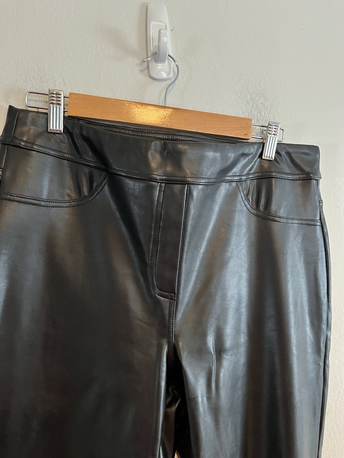 These black straight high rise leg pants feature a high-waisted design and a sleek leather-like finish that adds a touch of sophistication. The stretchy material provides a form-fitting silhouette, ensuring comfort and style for any occasion. Measurements Waist: 17 in Rise: 11 in Inseam: 27.5 in Length: 37.5 in Condition: New with tags. T006