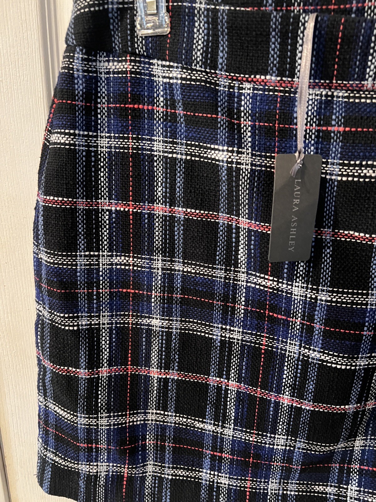 Laura Ashley black and blue plaid tartan skirt sz 16 NWT work academia career. $108 retail Waist measures approx 36” Waist to hem measures approx 21” DESCRIPTION Made with a woven check fabric in shades of blue, black, and pink, this skirt is quality style with a focus on colour. Pocket detailing at the waist makes this piece functional fashion, and it is versatile enough for laid back and smart looks alike.