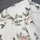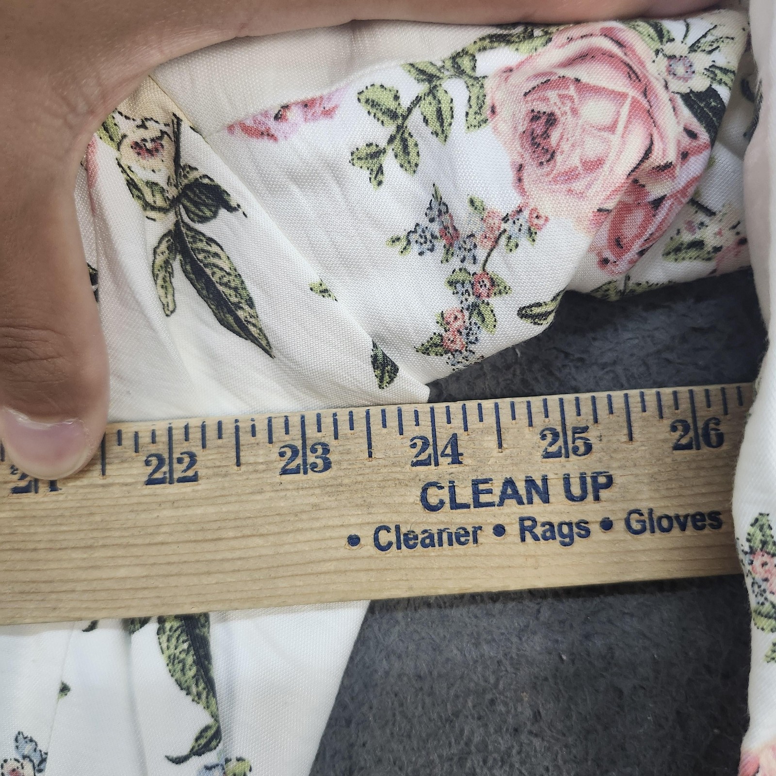 Brand: Lauren Conrad (LC) Style: Womens tailored blazer jacket in an white white floral print with pink and green rose pattern. Color: White base with multicolor floral design. Size on tag: XL Country of manufacture: Made in Vietnam. Details: Notched lapel collar, single-button front closure, two front welt pockets, ruched sleeves that hit around three-quarter length, slightly longer curved hem in back, fully lined interior with subtle dotted texture.