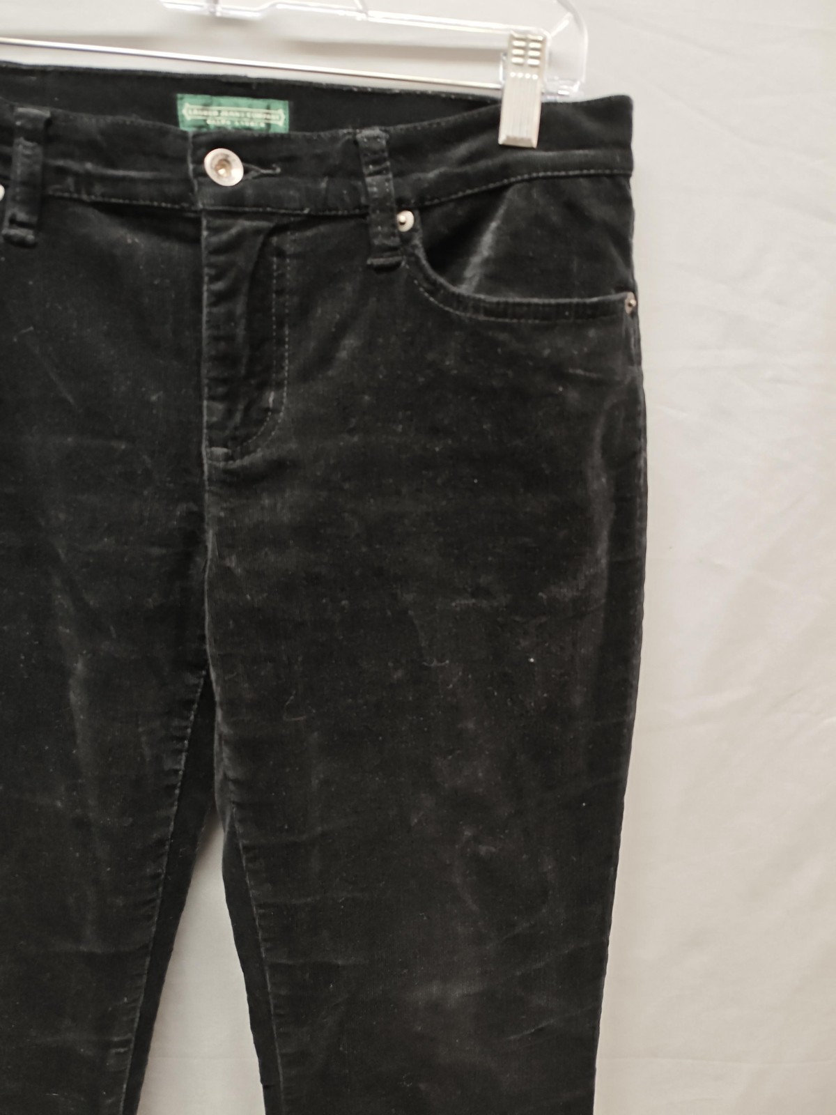 Brand: Lauren Jeans Company Ralph Lauren Item: Womens corduroy pants in a classic five-pocket jeans style with straight leg. Color: Black Size on tag: 6 Materials: 98% cotton, 2% elastane (per tag) Made in China. Details: Zip fly with button closure, belt loops, front hand pockets with coin pocket, rear patch pockets, silver-tone RLL Lauren Jeans Company logo patch at back waistband, soft corduroy fabric with a comfortable stretch.