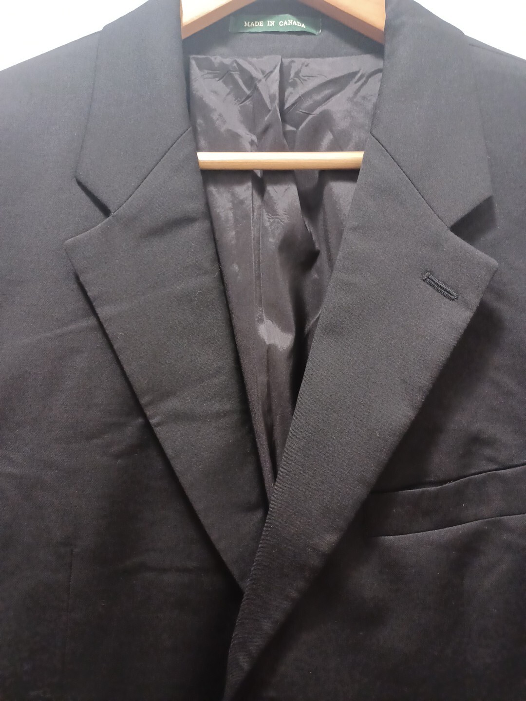 Elevate your formal attire with this Lauren Ralph Lauren suit jacket. Crafted from high-quality wool, this black suit jacket features a classic notch lapel style and a single-breasted cut with a two-button front button style. The jacket is single-vented and has a regular length that fits a chest size of 44. Perfect for any occasion, whether it's a business meeting, party, or cocktail event, this suit jacket is a must-have in your wardrobe. The jacket is dry clean only. The jacket is a designer classic piece that is perfect for any season, including winter, summer, fall, and spring. Great condition.