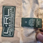 Brand: Lauren Ralph Lauren (LRL Lauren Active) Style: Womens cargo pants in a beige camouflage print with a straight-leg silhouette. Color: Beige / tan camouflage. Size on tag: 12 Regular. Material: 100% cotton ripstop; made in Philippines. Details: Zip fly with double button closure, belt loops, front hand pockets, flap cargo pockets with logo snap buttons, back flap pockets, articulated knee seams, adjustable drawstring ties at hems, army-inspired casual utility design. Suitable for casual everyday wear, travel, or outdoor activities.
