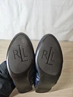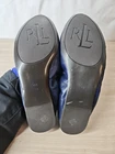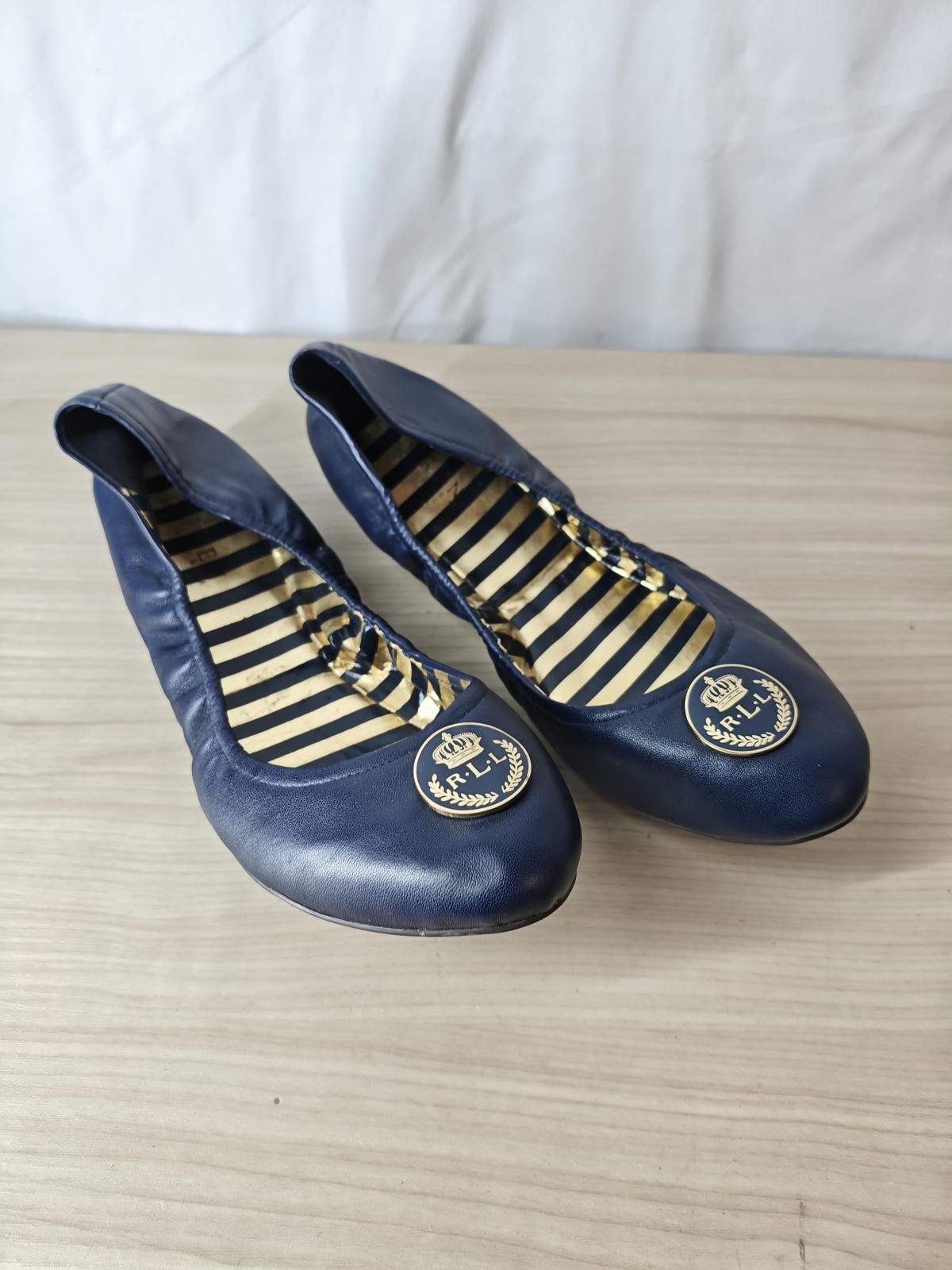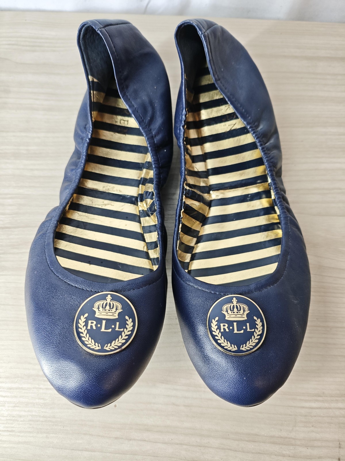 Brand: Lauren Ralph Lauren (RLL) Style: Womens round-toe ballet flat shoes with elasticized sides and easy slip-on design. Color: Navy blue upper with gold and dark navy striped footbed; gold-tone RLL crest logo medallion on each toe. Size on sole: 11B (womens medium width). Materials: Upper material not listed, feels like smooth faux leather; man-made outsole with embossed RLL logo tread. Details: Low-profile flat heel, cushioned striped insole, gathered heel and sides for flexible fit, classic preppy logo detail, slip-on comfort. Notes: No original box or tags included. Condition notes: Light creasing and a few small scuffs on uppers, noticeable wear and some flaking to the metallic striped insoles, and light wear with minor marks and sticker residue on the outsoles; please review photos for close-up views.