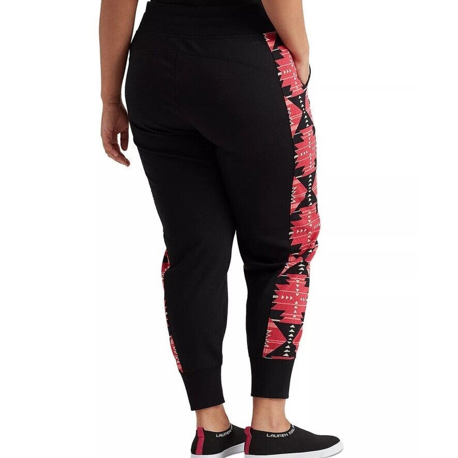 Lauren Ralph Lauren Women Black French Terry Sporty Jogger Pants Plus Size 3X New with tags MRSP $110 Ribbed elasticized waistband Drawcord with signature cord ends Two front angled pockets Embroidered "LRL" monogram at the back right waist Curved back yoke seam Printed side panels Ribbed cuffs Skinny fit 83% cotton / 17% polyester Machine washable Inseam 29.5" Waist flat lay 22.5" Total length (side seam) 41"