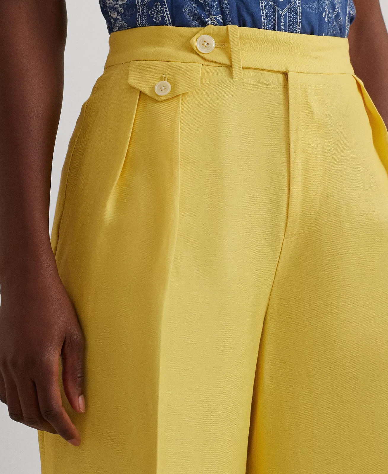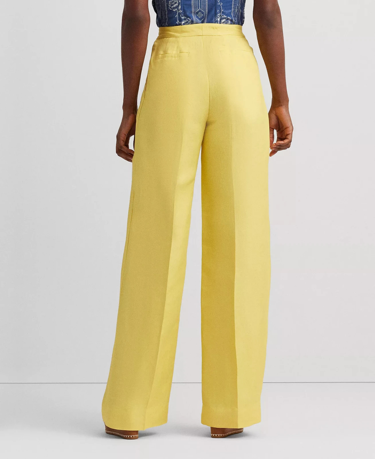 Cut for a wide-leg silhouette , these Lauren Ralph Lauren high-rise pants are crafted from a lightweight linen-blend twill for a polished, breathable feel. Designed to hit below the ankle , they feature crisp creases down the front and back of each leg to create a flattering, leg-lengthening effect. Tailored details such as front waist pleats , back waist darts , and an extended buttoned waist tab elevate the look, making these pants ideal for workwear or refined everyday styling. Details Brand: Lauren Ralph Lauren Style: Wide-Leg Pants Size: 14 Rise: High rise Silhouette: Wide-leg Length: Intended to hit below the ankle Inseam: Approx. 32" Leg Opening: Approx. 28-1/2" (based on size 8; varies by size) Closure: Zip fly with interior buttoned closure Waist Detail: Extended buttoned waist tab with single keeper Pockets: Two front angled waist pockets Two back waist welt pockets Buttoned-flap ticket pocket at right waist Details: Front waist pleats Back waist darts Creases on front and back of each leg Material: Linen, Viscose Care: Dry clean Country of Manufacture: Imported