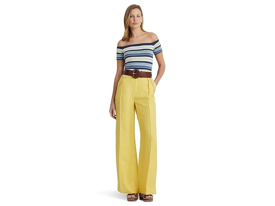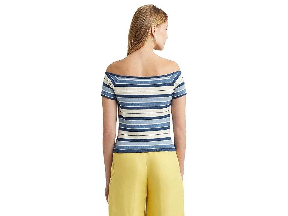 Get set to dazzle in LAUREN Ralph Lauren Off-the-Shoulder Striped Sweater! Flaunt trendy vibes with its variegated double colored stripes, designed for a figure-hugging slim fit. Crafted with a lightweight blend including linen, it promises a soft to Off-shoulder design 50% linen, 41% cotton, 9% nylon Hand wash only