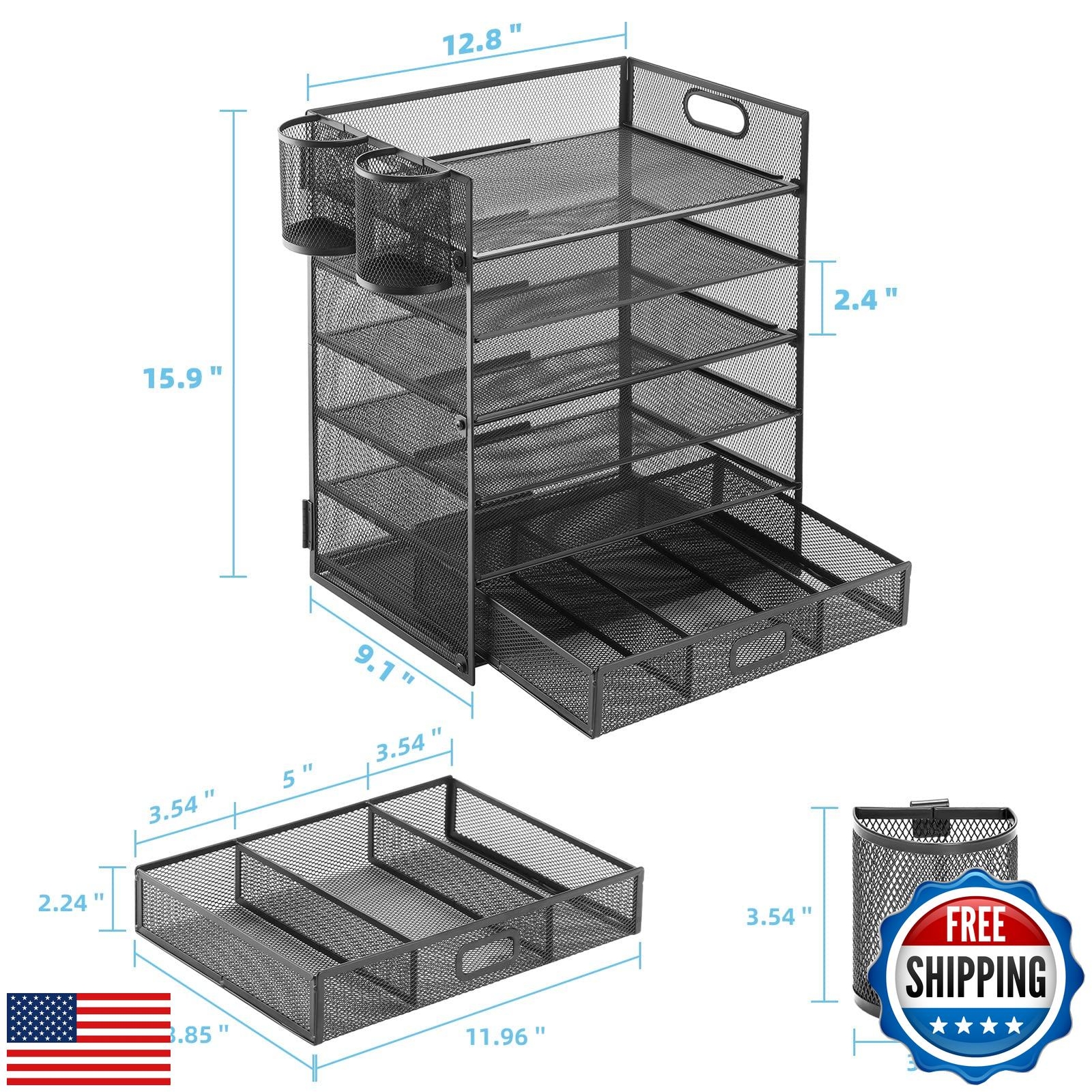 Lavatino 6 Tray Paper Organizer Letter Tray with Drawer - Mesh Desk File Organizer, Paper Sorter Organizer for Office, Home or School File Folder Holder - Black Features 【Upgraded Desk Organizer】The humanized office organization owns 1 sliding drawer + 2 Hanging Pencil Holders and 2 Protable Handles which tidies up your desktop and is convenient to your office! All the designs specialized to comply with your office, such a perfect supplies desk organizer must be the best choice for your office accessories! 【Multifunction Organization】The paper tray organizer is very suitable for storing books, magazines, letters, and A4 paper. The drawer organizer and hanging pen holder enough accommodate all office supply accessories, such as pens, pencils, scissors, and so on. Perfect Size: 12.1*15.9*9.1 inch. 【Easy To Assemble】The installation of the office supplies organizer can be completed in 12 minutes follow the instruction book, super easy to assemble don't worry about any questions about that! 【Premium Material】The desk organizers and accessories is made of lightweight durable metal mesh and reinforced with a solid steel frame that makes it have long-lasting strength and reliable performance. 【Risk-Free Purchase】Our store regard customer satisfaction as our biggest motivation. So, if there is any problem with our product, please be free to contact us, we would offer a 90-day return policy! there is no risk at all, please do not hesitate to order soon! Shipping Free & Fast Shipping: We offer free shipping to most of the USA with a normal delivery time of 3-7 days. However, due to the current situation, additional delivery time (up to 3 weeks) may be required for some items. Alternative Carriers: We may use alternative carriers (e.g., USPS, FedEx, UPS) to ensure your package arrives safely and on time. Due to the use of multiple carriers, we are unable to provide a tracking number automatically. Handling Time: Orders are processed and shipped within 1-2 business days of receiving cleared payment. Shipping Restrictions: Shipping to Alaska, Hawaii, Puerto Rico, Guam, and other US territories may incur shipping charges or delivery restrictions. Please contact us before ordering, or your order can be refunded/cancelled. State Restrictions: Certain items may not be shipped to California due to state regulations. Contact for Tracking Updates: If you require tracking updates or have any concerns about the delivery of your order, please feel free to contact us, and we will be happy to assist you. Return Policy 30-Day Hassle-Free Returns: If you are not completely satisfied with your purchase, you can return the item for free within 30 days of receiving it for a full refund or exchange. Easy Return Process: Contact us, and we will provide you with a prepaid return shipping label and detailed instructions. No Restocking Fee: There are no restocking fees for returns. However, the buyer is responsible for return shipping costs if the return is not due to a seller's error. Refund Processing: Refunds will be processed within 1 business day of receiving the returned item in its original condition. Payment We accept all major credit cards, PayPal, and Apple Pay for your convenience. Your payment information is secure and encrypted to ensure a safe and seamless transaction. Please complete your payment within 3 days of purchase to avoid any delays in shipping. Feedback Your feedback is extremely important to us. We strive to provide the best products and customer service possible. If you are satisfied with your purchase, please take a moment to leave us a positive review. If you have any concerns or issues with your order, please contact us before leaving negative feedback. We are committed to resolving any problems and ensuring your satisfaction. Contact Us If you have any questions or concerns, please feel free to reach out to our customer support team. You can contact us through the eBay messaging system. We are available Monday to Friday, 9:00 am to 5:00 pm EST, and we will do our best to respond to your inquiry within 24 hours. Thank you for supporting our small family business!